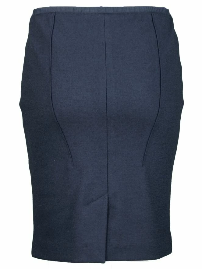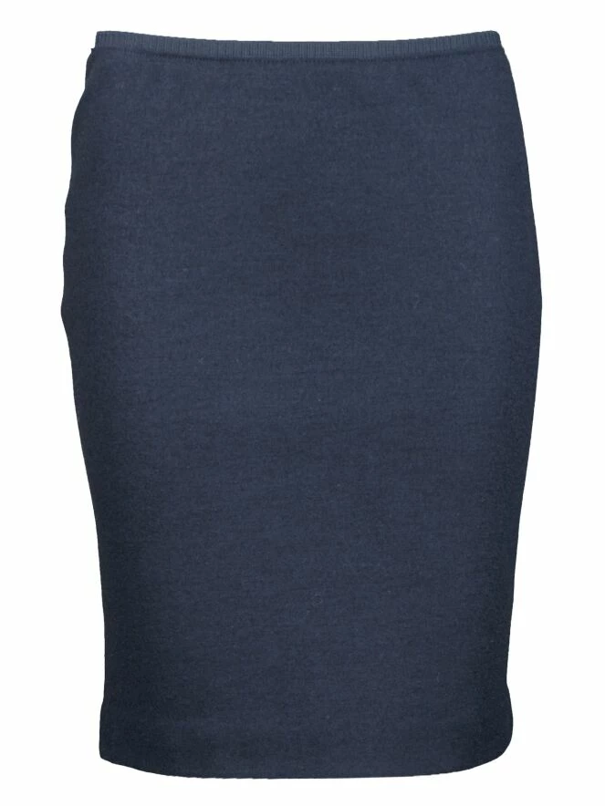 Jupe en fine laine vierge et cachemire, de la marque Marc Cain, de couleur bleu marine. Elle descend au-dessus du genou. La jupe est doublée et dotée d’une petite fente d’aisance au milieu du dos. La ceinture élastique de 3 cm à la taille assure un grand confort et une coupe irréprochable. Lavage déconseillé.