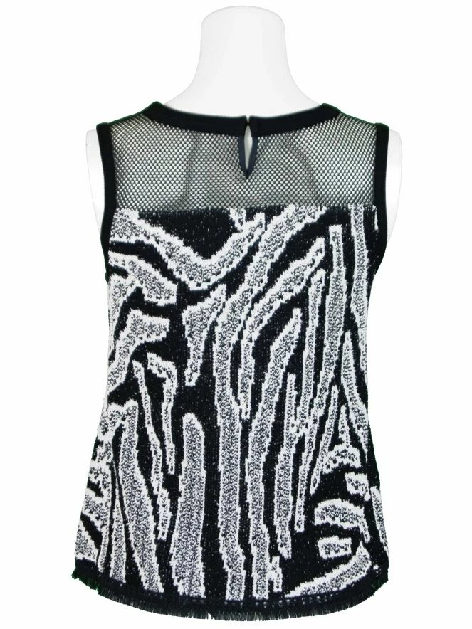 Top élégant de la marque Marc Cain à l’imprimée de couleurs mêlées noir et blanc, coupe légèrement évasée. Le haut de la partie arrière est en maille filet. Lavage à 30 degrés.