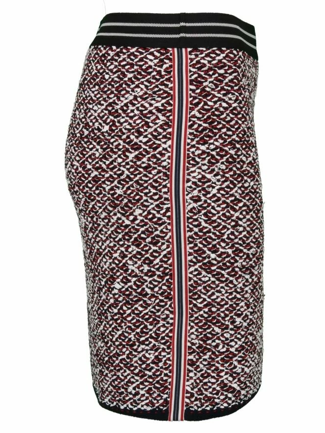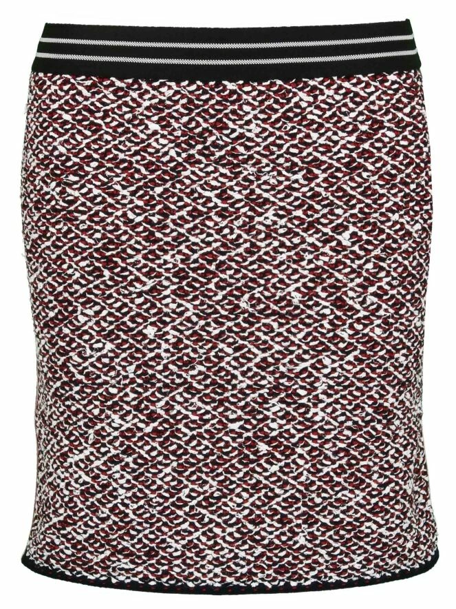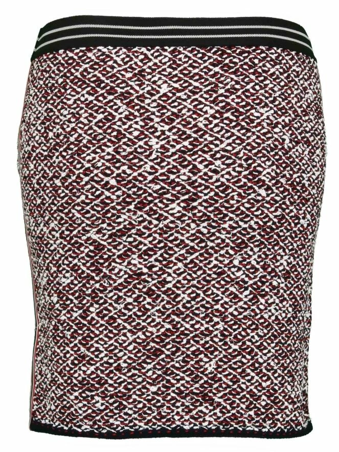 Jupe courte au-dessus du genou, de la marque Marc Cain, imprimé tweed aux couleurs rouge, noir et blanc. Une bande élastique dans un motif rayé blanc noir à la taille lui apporte un grand confort. Les côtés présentent un passepoil rayé en rouge, noir et blanc, lui donnant une touche sportive. Lavage à la main.