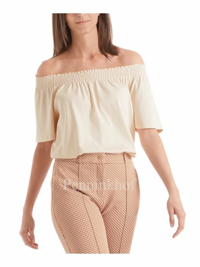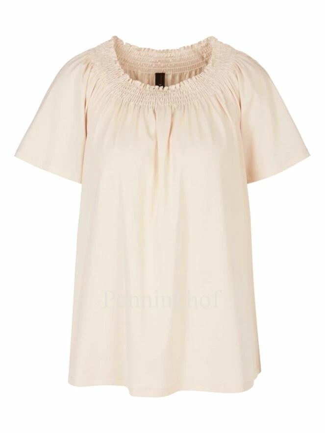 Tee-shirt à la coupe large et à manches courtes, de la marque Marc Cain de couleur beige. Ce tee-shirt est doté d’une encolure élastique à quatre rangées froncées. Lavage 30 degrés.