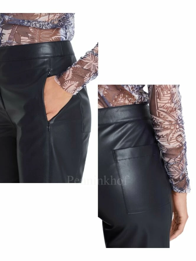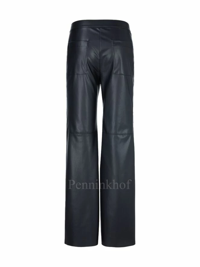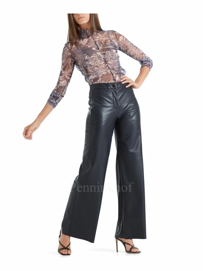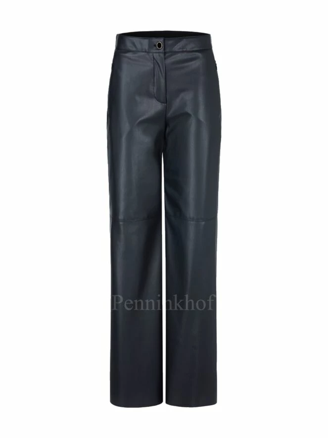 Pantalon à la coupe ample en similicuir nappa de la marque Marc Cain, de couleur bleu marine. Il est doté de poches latérales zippées et de deux poches arrière plaquées. Lavage à 30 degrés.