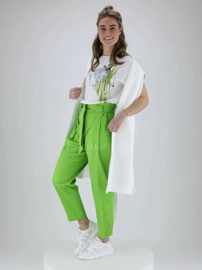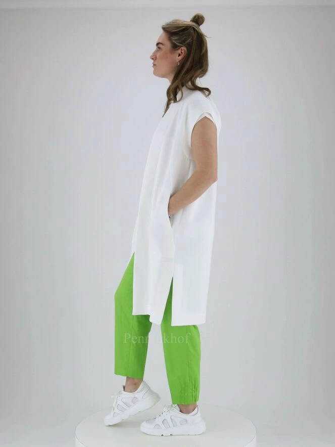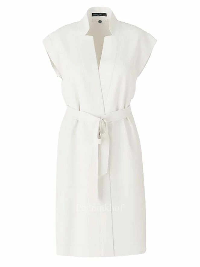 Longue veste à manches courtes recoupées de la marque Marc Cain, de couleur blanche. La veste est sans boutons et peut se fermer à l’aide d’une ceinture du même tissu. Elle est équipée de poches latérales. La base est munie de fentes sur les côtés. Lavage à 30 degrés.