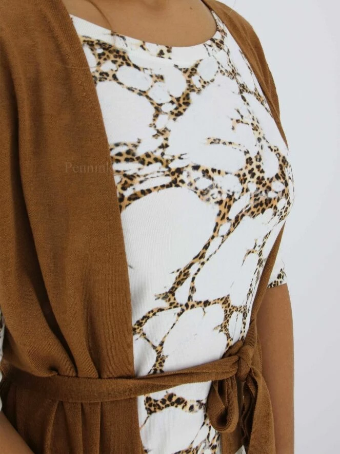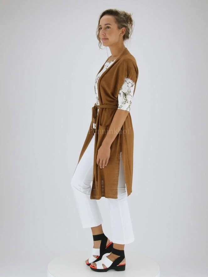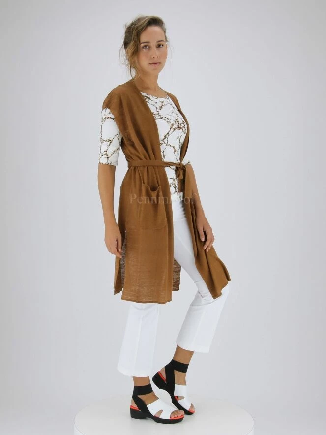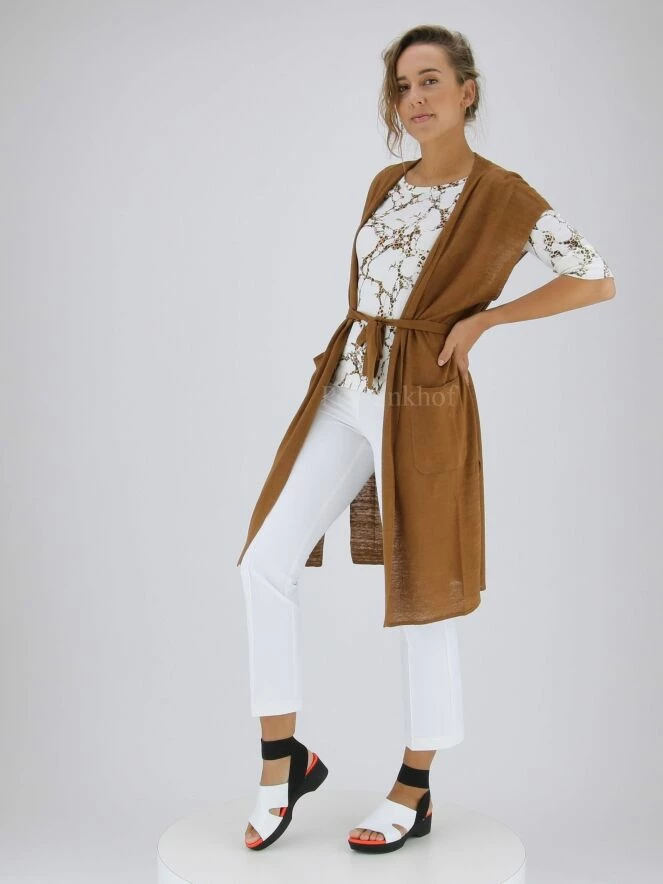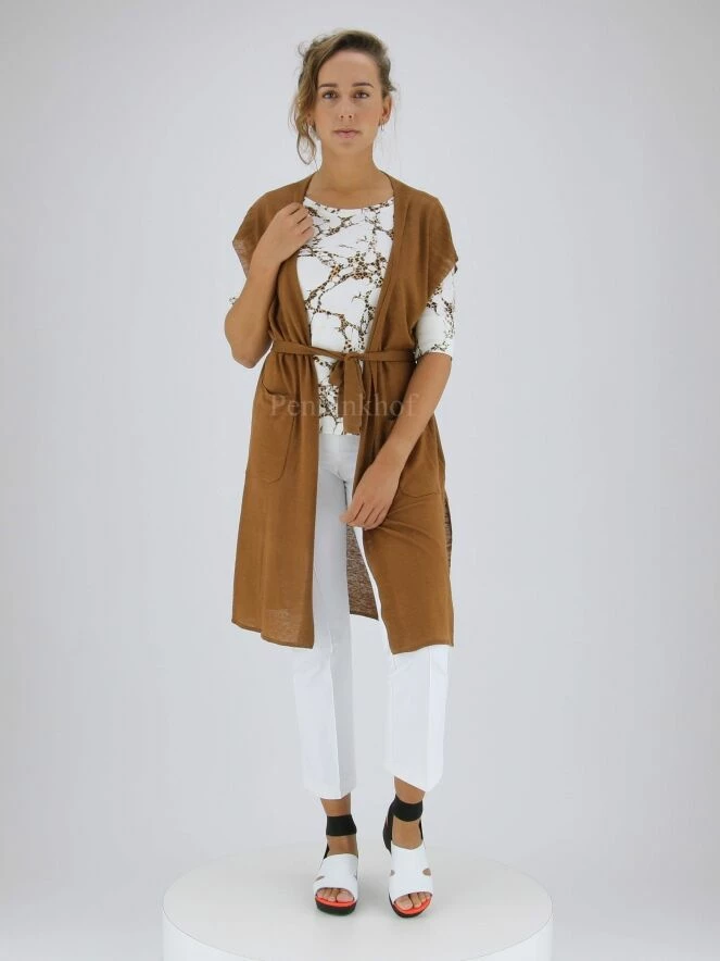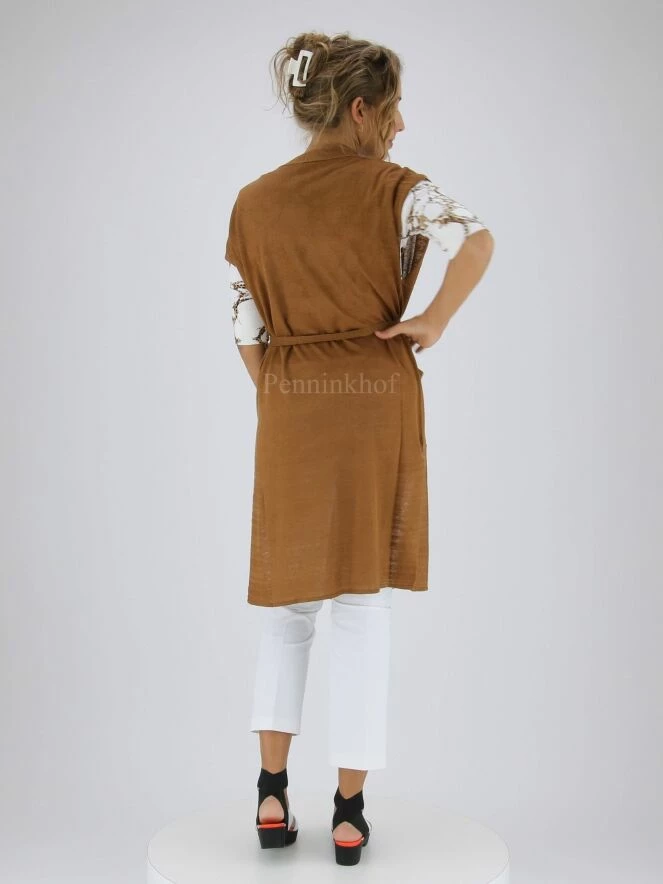 Luxueux gilet long de la marque Marc Cain, de couleur marron. Le gilet ne possède pas de fermeture, mais une ceinture à la taille dans le même tissu. Le bout des manches est bordé d’une bande à fines côtes. Ce détail revient le long des profondes fentes latérales. Le gilet est muni des poches plaquées ouvertes à l’avant. Lavage à 30 degrés.