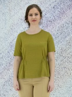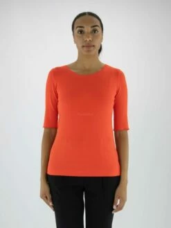 T-shirt à matières mélangées de la marque Marc Cain, de couleur mandarine. Col en V arrondi à manches courtes. La base est pourvue de courtes fentes latérales élégamment surpiquées. Lavage à 30 degrés.