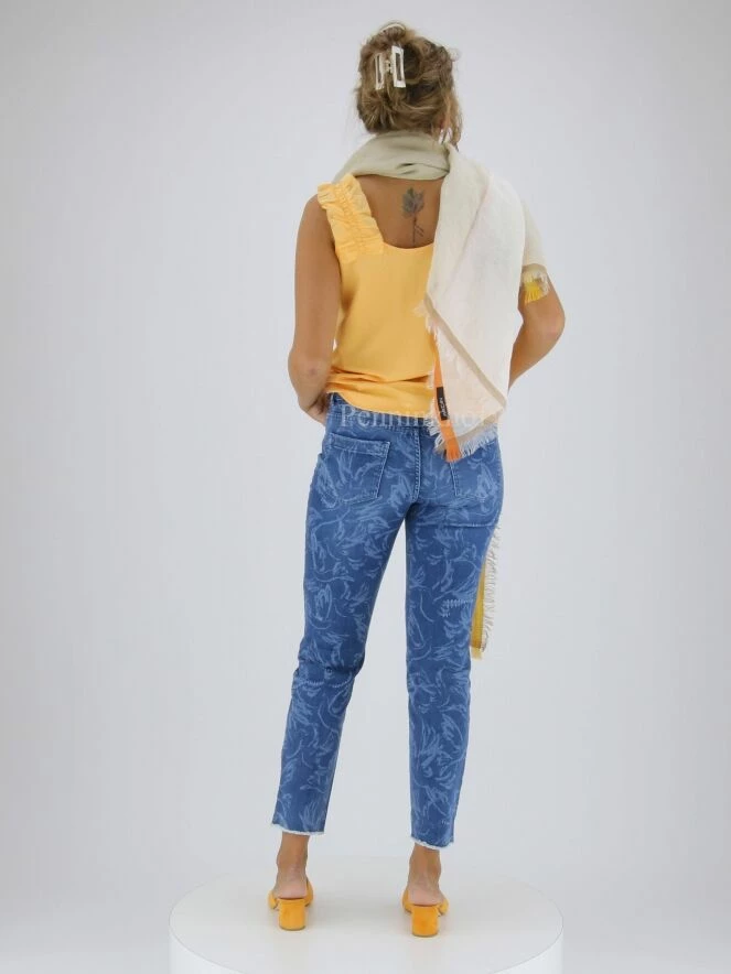 Top sans manches de la marque Marc Cain, de couleur mandarine. L’encolure en V est bordée d’une large garniture de ruchés fins surpiqués. Lavage à 30 degrés.