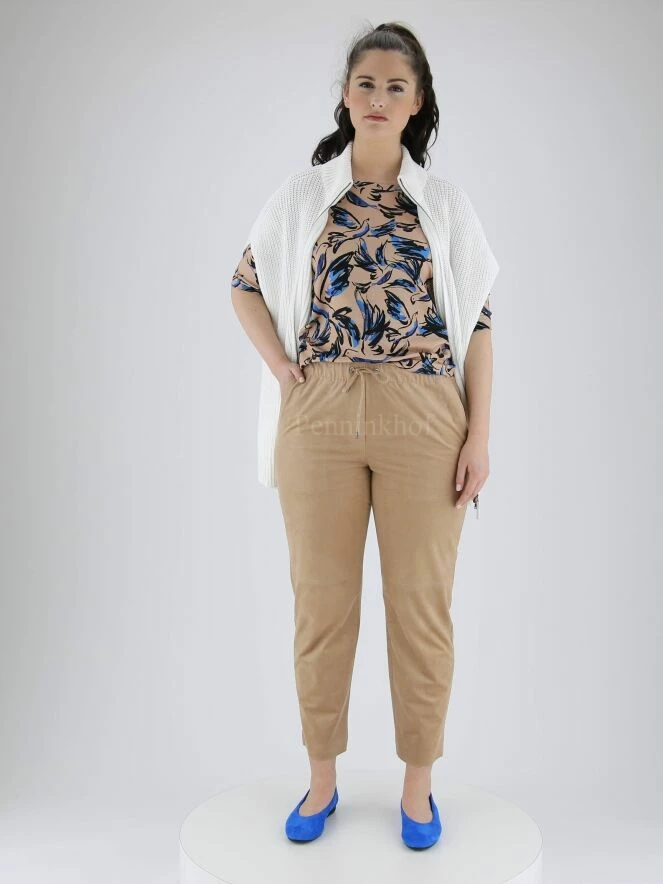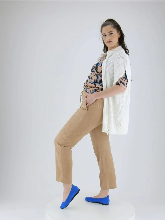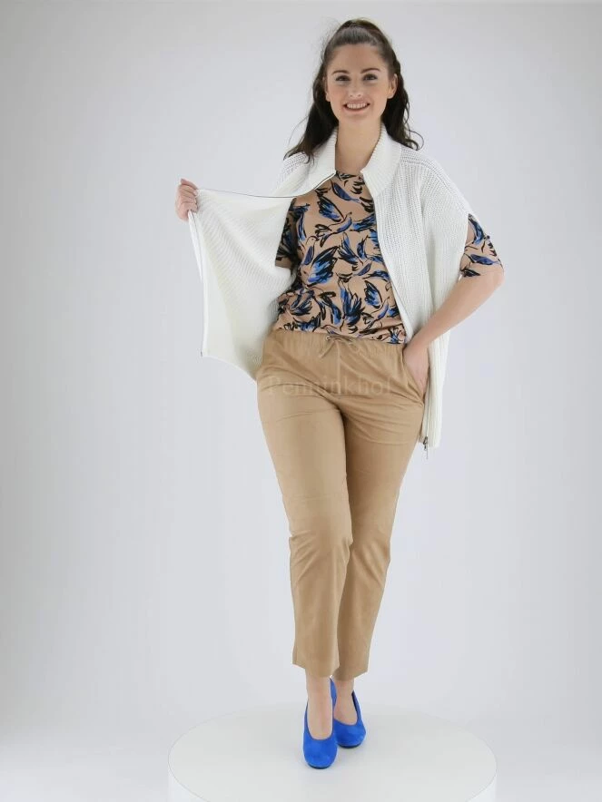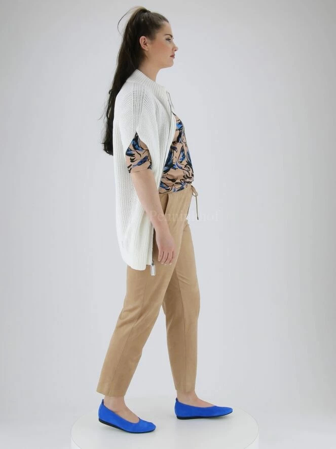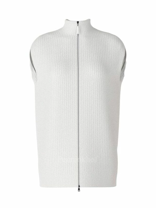 Spencer de la marque Marc Cain, en maille tricotée de couleur blanc crème. Il présente de larges emmanchures à épaules tombantes. Le gilet est doté d’une fermeture Eclair sur toute sa hauteur et d’un col montant. Le gilet peut être lavé à 30 degrés.