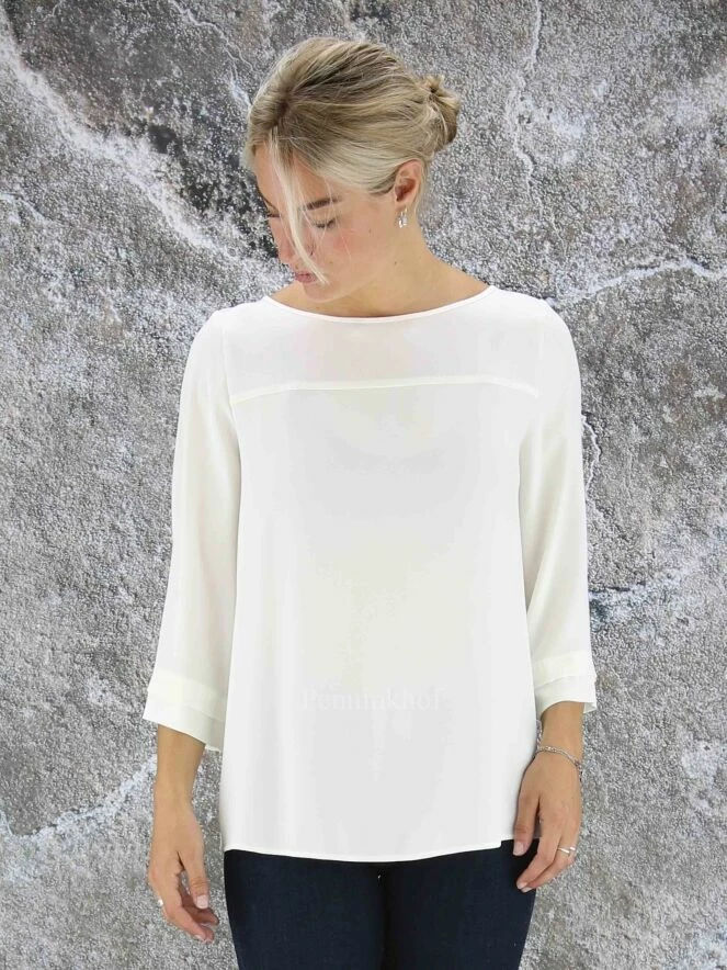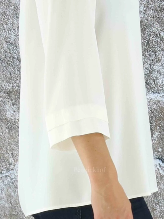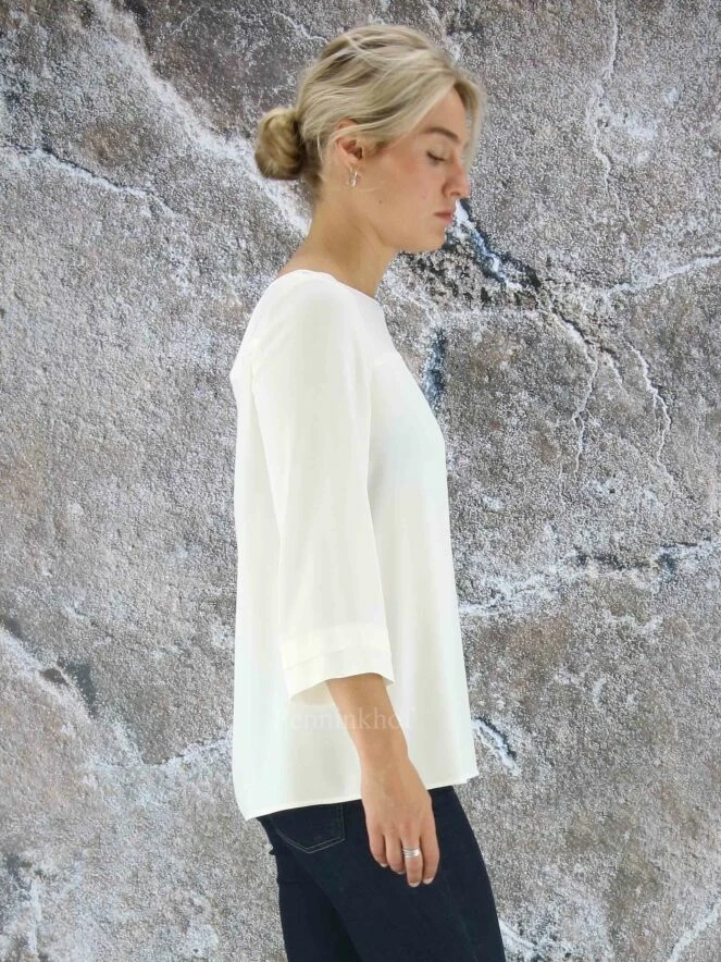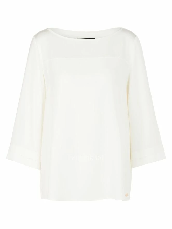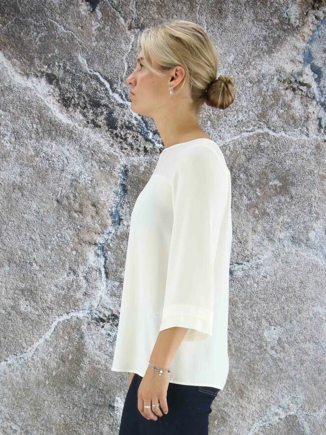 Tee-shirt-chemise légèrement transparente de la marque Marc Cain, de couleur blanc crème. La chemise présente un large col ras du cou et des manches trois-quarts. Une surpiqûre horizontale décorative orne le dessus du buste. Lavage à 30 degrés.