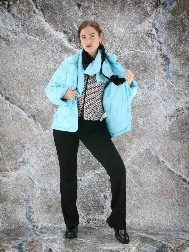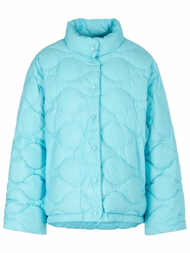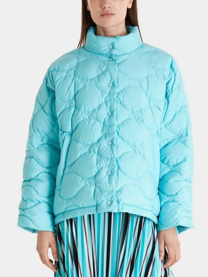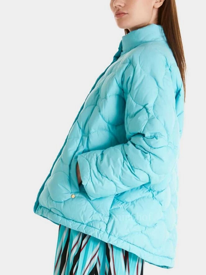 Doudoune de la marque Marc Cain, de couleur bleu doux. Sa coupe boule ample et décontractée est à motif ondulé surpiqué. Elle ferme à l’aide de boutons pression et possède des poches latérales. Lavage à 30 degrés.