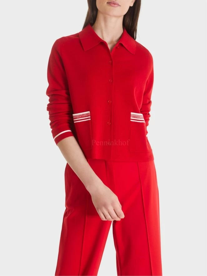 Cardigan court de la marque Marc Cain, de couleur rouge. Il est doté d’un col chemise et d’une patte de boutonnage qui ferme par un bouton haut. Les rayures de couleur contrastante en fin jersey côtelé sur les poches plaquées avant et au bas des manches apportent une belle touche de style. Lavage à 30 degrés.