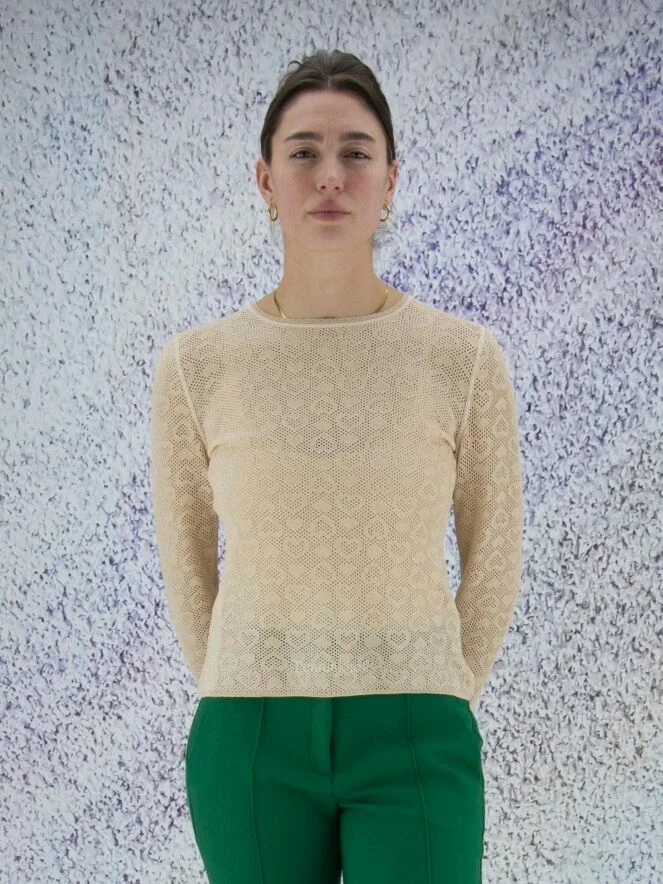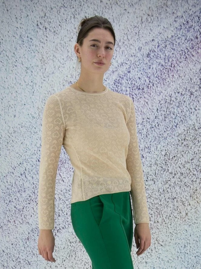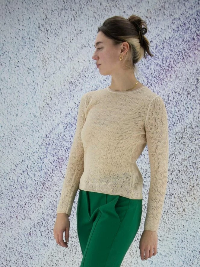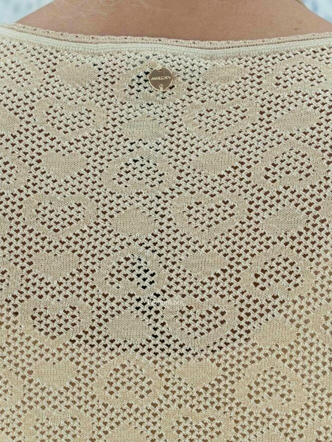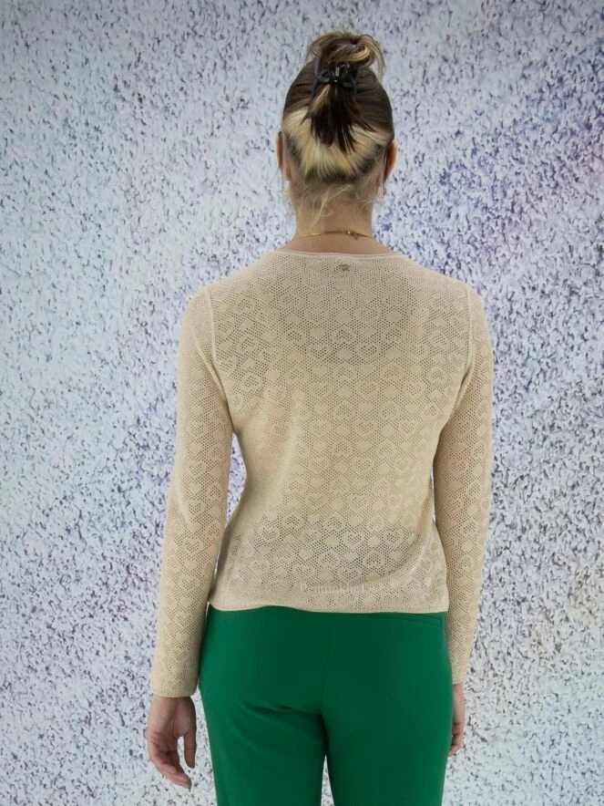 Tee-shirt perforé de la marque Marc Cain, de couleur nude avec un fil doré à travers le tissu. Deux modèles de cœurs sont tissés dans le tissu. Le col est bordé d’un liseré ajouré. Lavage à 30 degrés.