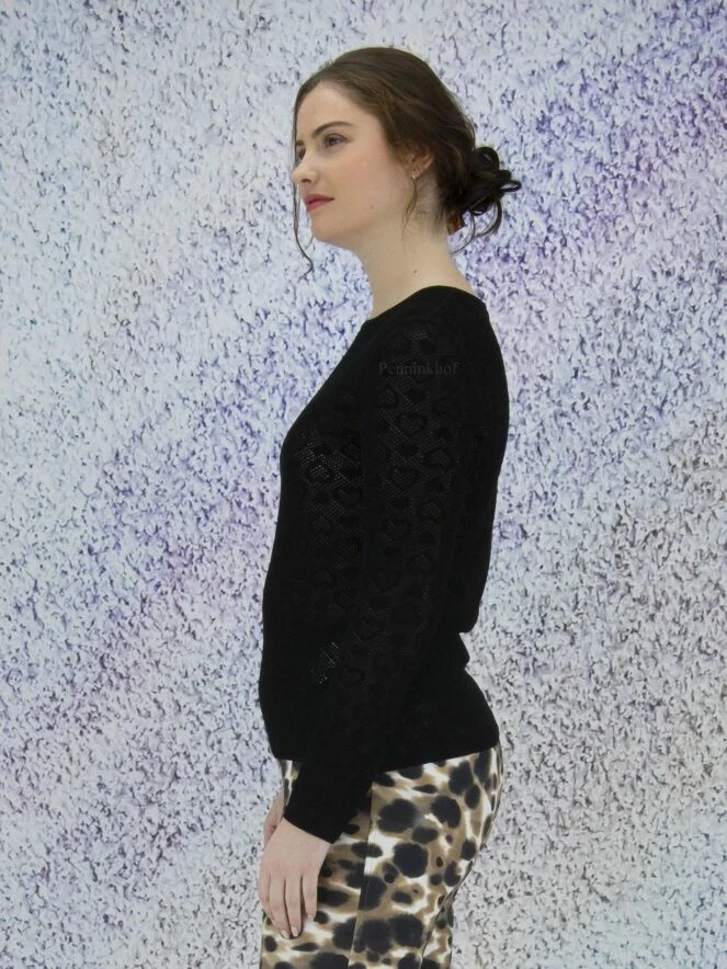 Tee-shirt transparent à fines perforations de la marque Marc Cain, de couleur noire. Une mosaïque de cœurs est tissée dans le tissu. Il présente un col rond et des manches longues. Lavage à 30 degrés.