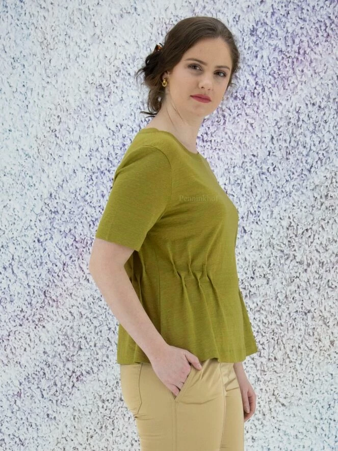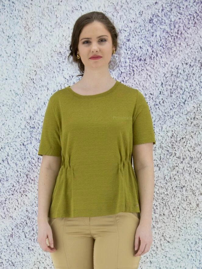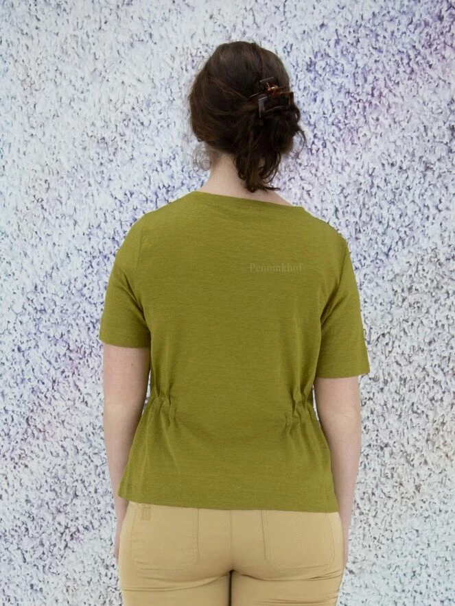 Tee-shirt à la coupe cintrée en matières mélangées, de la marque Marc Cain, de couleur vert pistache. La chemise présente un col rond et des manches courtes. Au niveau de la taille, des plis cousus sur les côtés apportent un effet smocké. Lavage à 30 degrés.