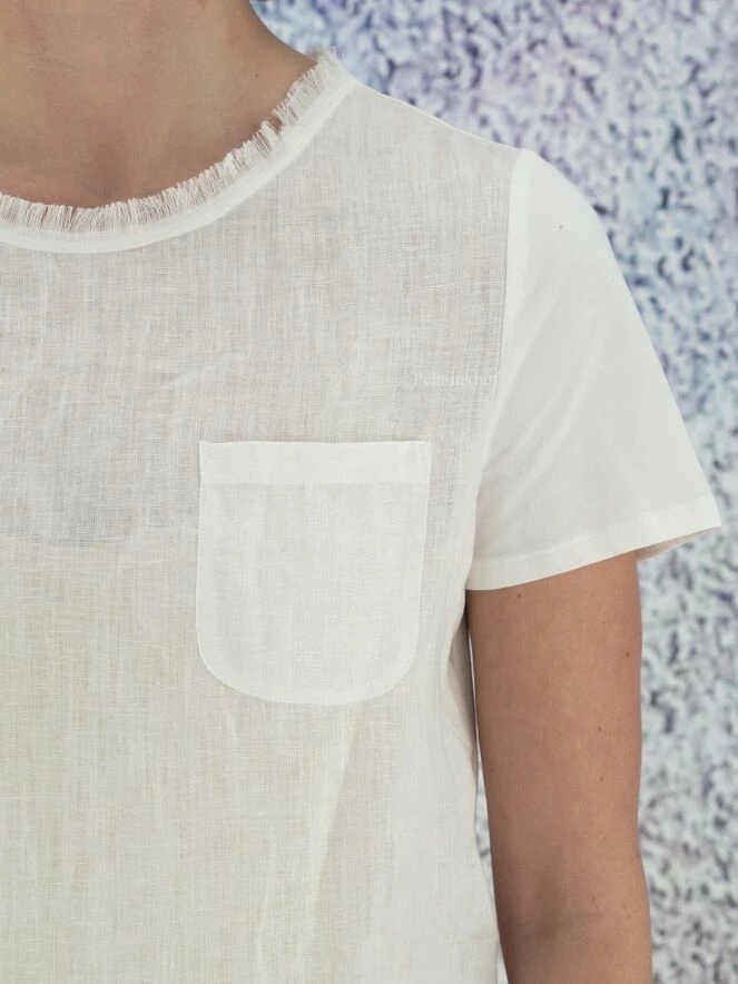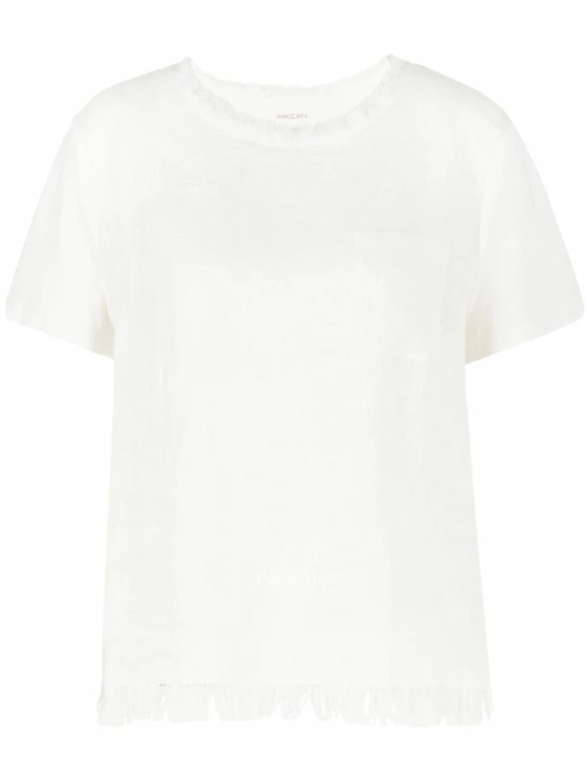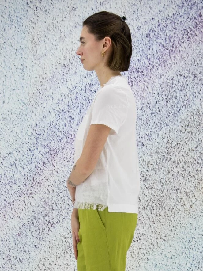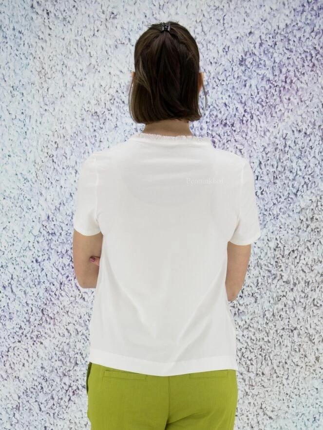 Tee-shirt à la coupe carrée de la marque Marc Cain, de couleur blanc crème. L’encolure ronde et le bas du tee-shirt sont bordés de fines franges. Lavage à 30 degrés.