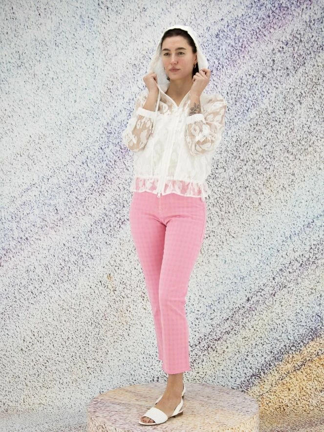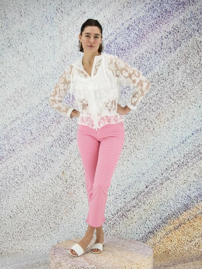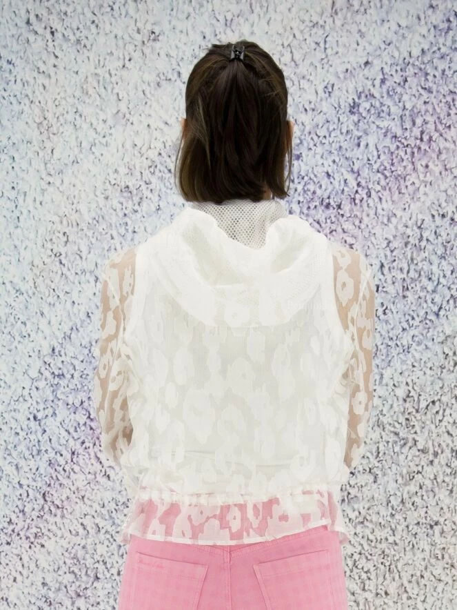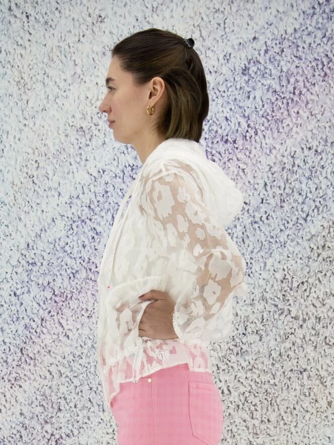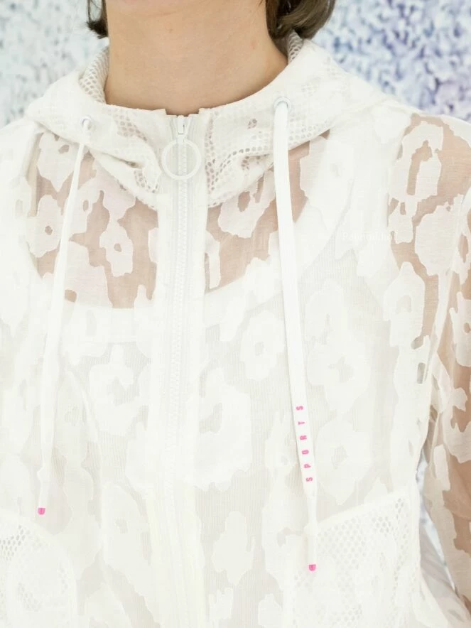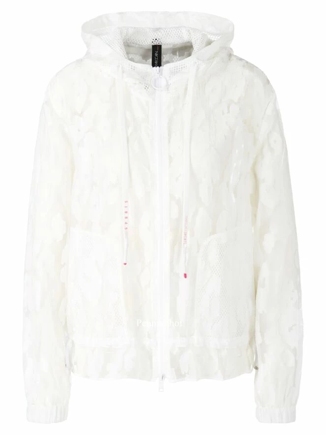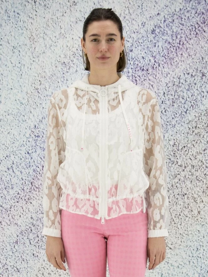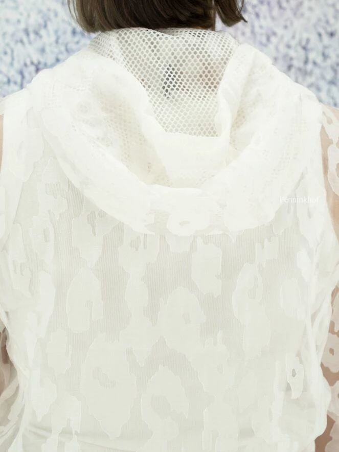 Cardigan transparent à capuche de la marque Marc Cain, à structure léopard de couleur blanc crème. La capuche est bordée par un cordon coulissant sous tunnel permettant le réglage. La capuche et les poches latérales sont doublées de maille filet. Ce modèle se ferme par un zip et possède un cordon coulissant sous tunnel au-dessus de la base. Les manches sont dotées d’une finition élastique. Lavage à 30 degrés.