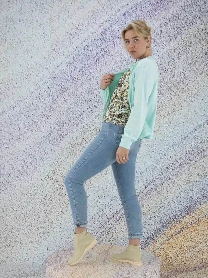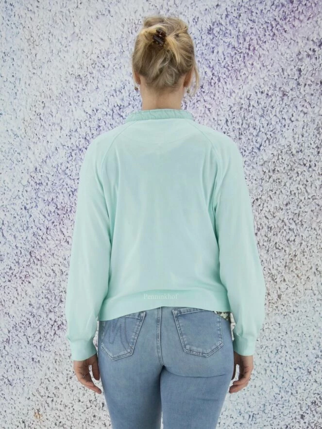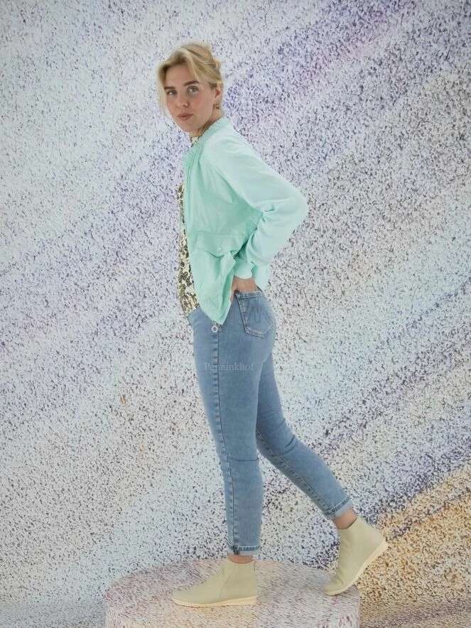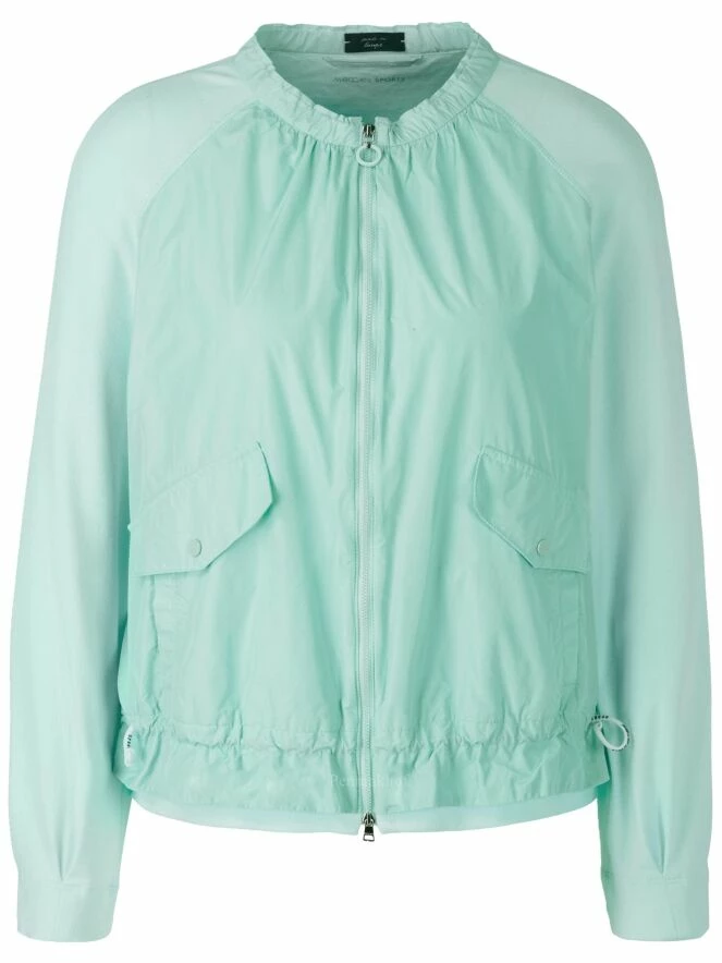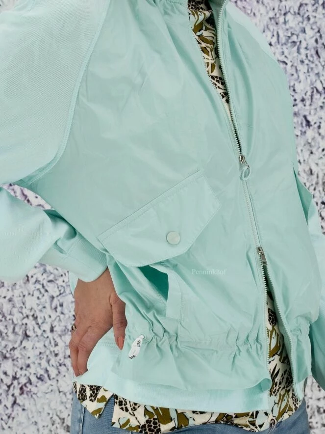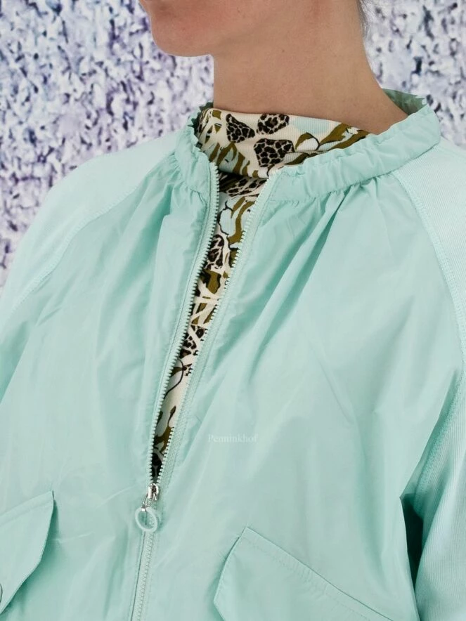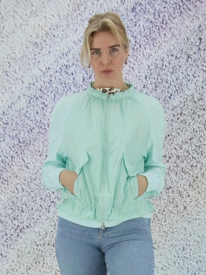 Blouson en fine maille côtelée de la marque Marc Cain, de couleur vert menthe. Il est confectionné en double épaisseur sur le devant. Le cordon de serrage permet de créer un effet à ruchés discret à la base. Le col montant légèrement froncé lui donne une belle ampleur sur le devant. Ce blouson présente des poches latérales à rabats et une fermeture zippée. Lavage à 30 degrés.