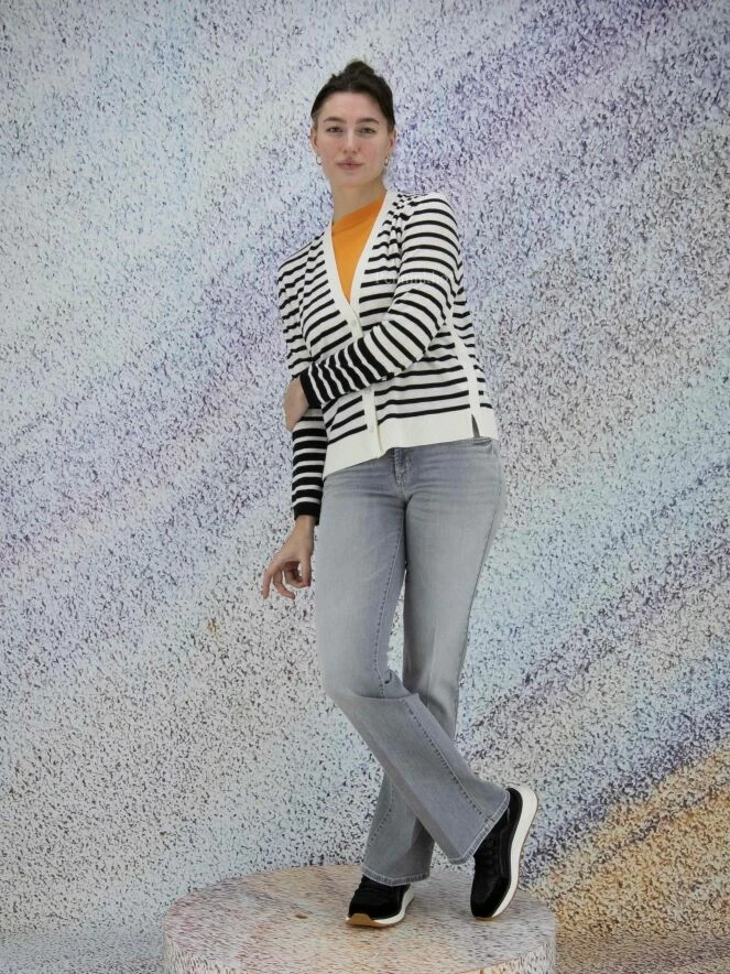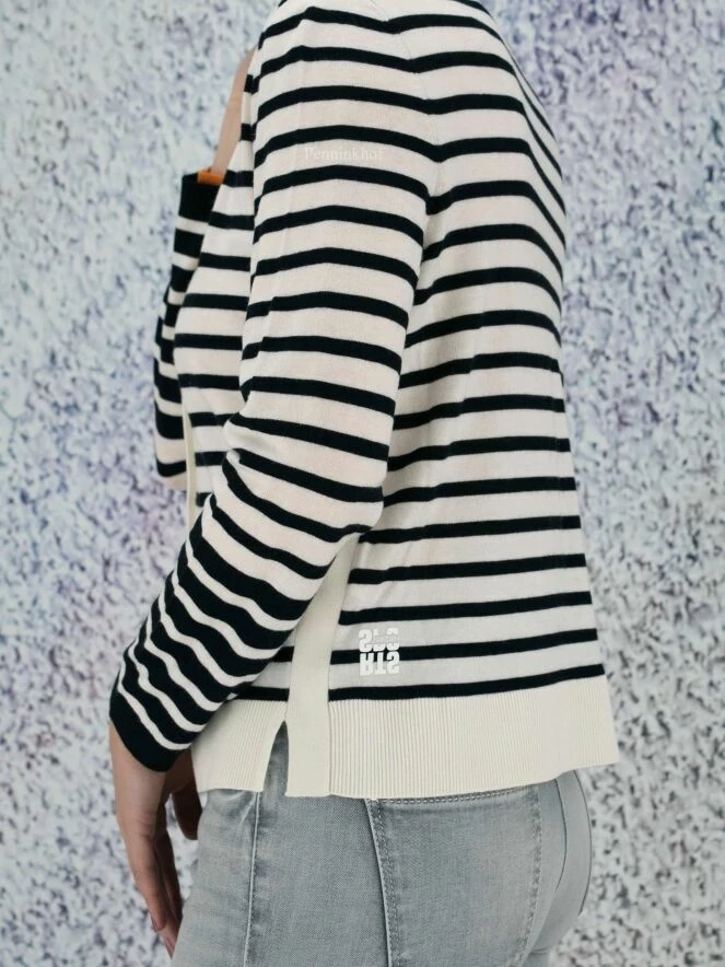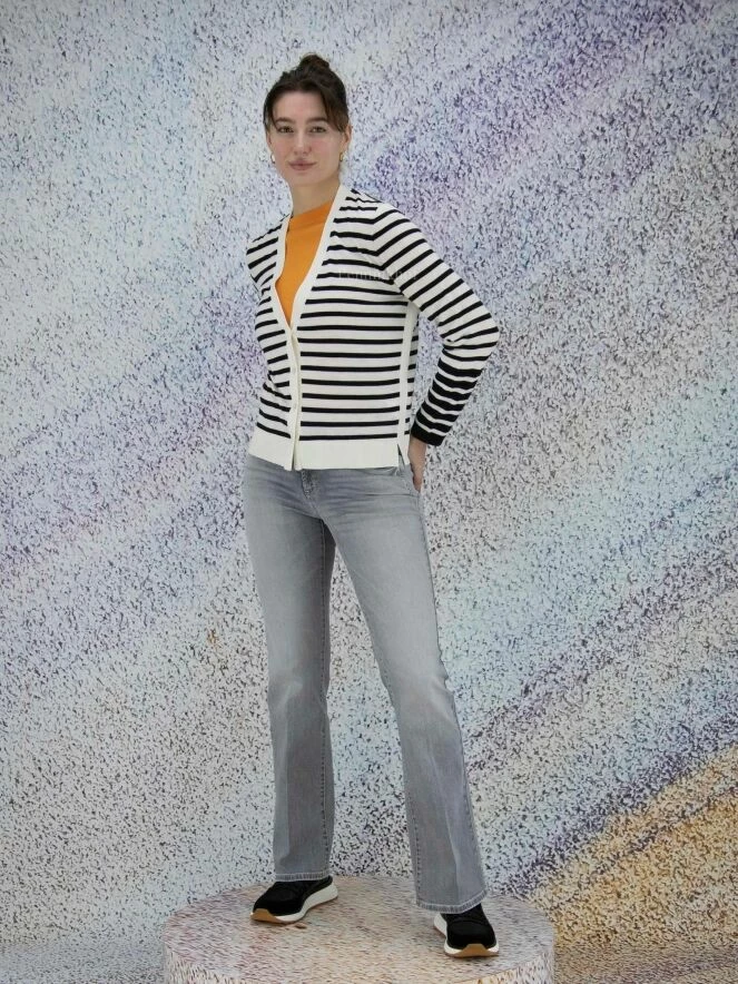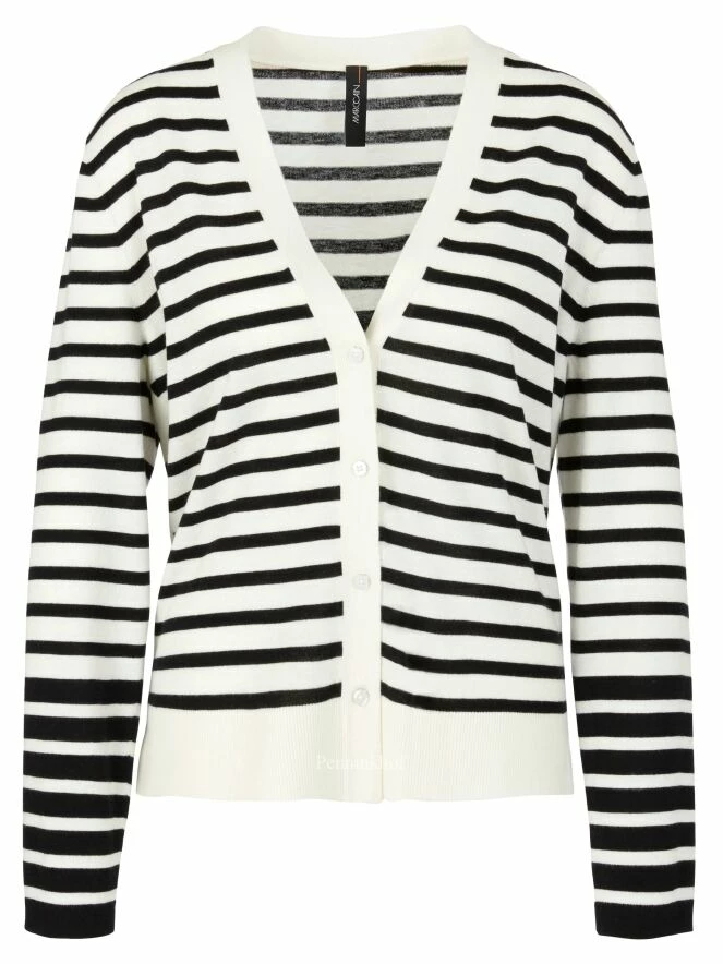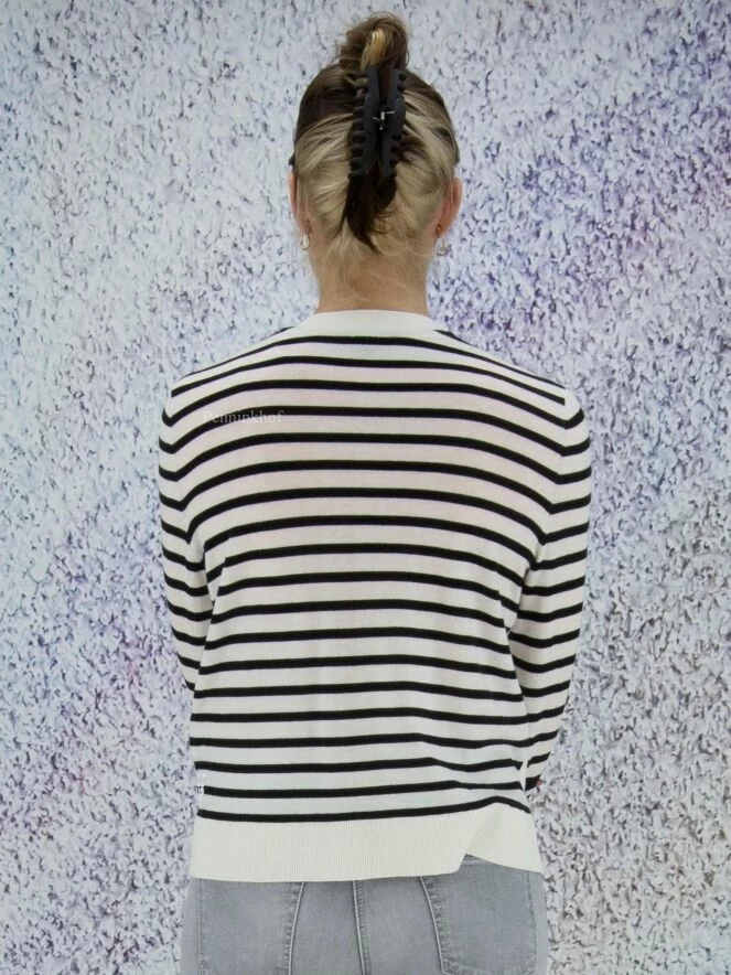 Cardigan marin en mélange de matières haut de gamme, de la marque Marc Cain, à rayures noir et blanc crème. Une garniture blanc crème orne les côtés et le bas du dos. Le cardigan présente un col en V en tricot finement côtelé. De petites fentes latérales soulignent sa coupe décontractée. Lavage à la main.