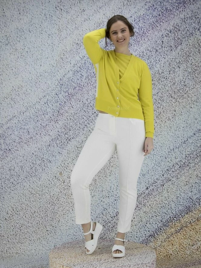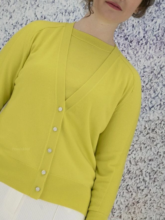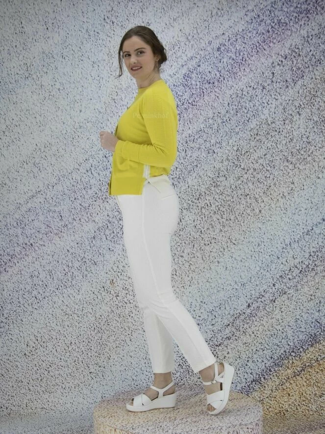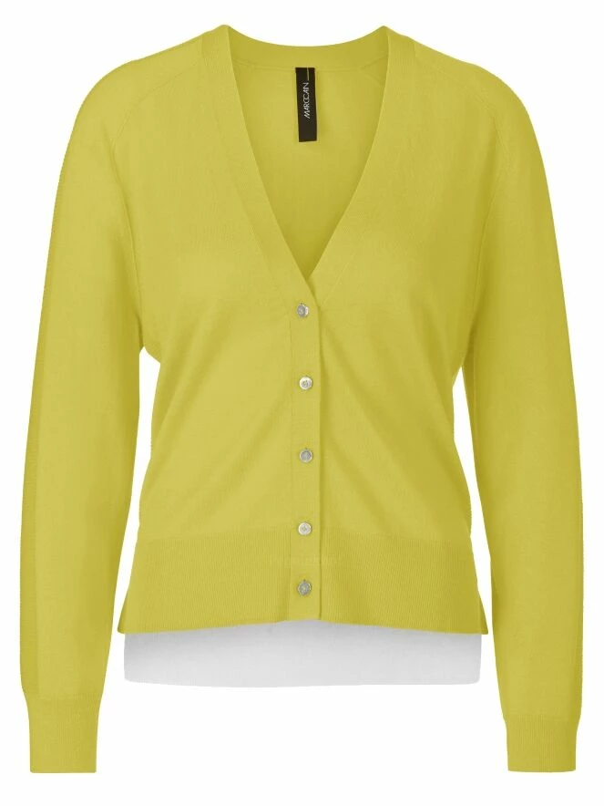 Gilet à patte de boutonnage de la marque Marc Cain, de couleur jaune citron. Une garniture blanc crème orne les côtés et le bas du dos. Des côtes sont présentes sur les épaules, l’extérieur des manches, l’encolure en V, le bas du gilet et les côtés. Une petite fente d’aisance latérale est présente sur chaque côté. Lavage à la main.