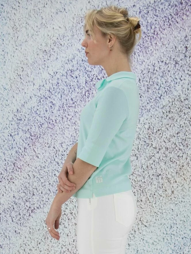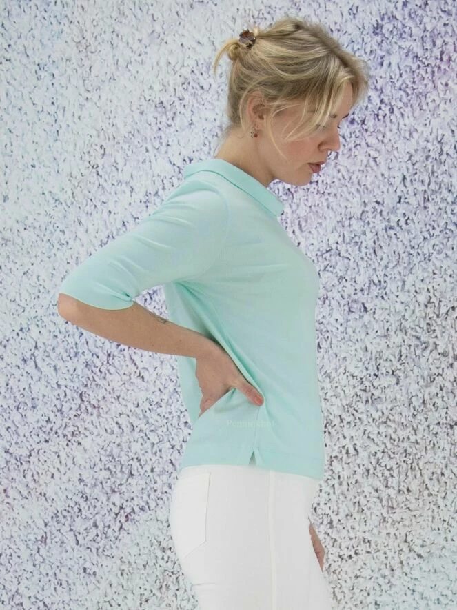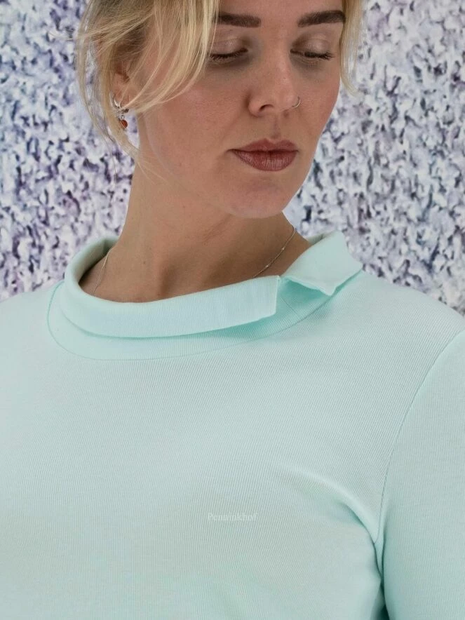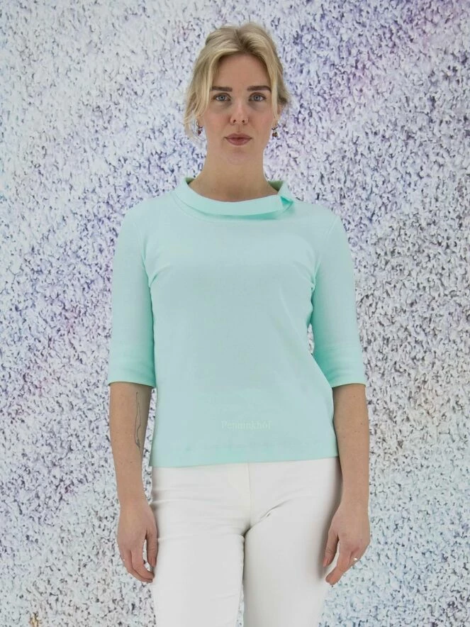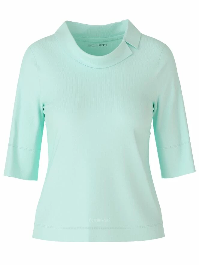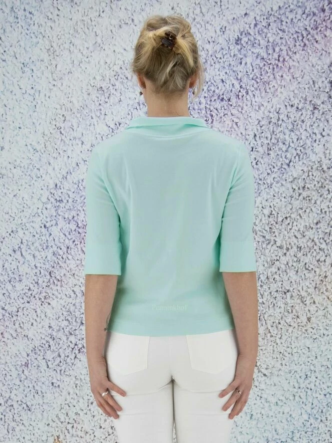 Tee-shirt à manches courtes de la marque Marc Cain, de couleur vert menthe. Le tee-shirt présente un col montant lâche avec une fente sur l’avant gauche. Lavage à 30 degrés.