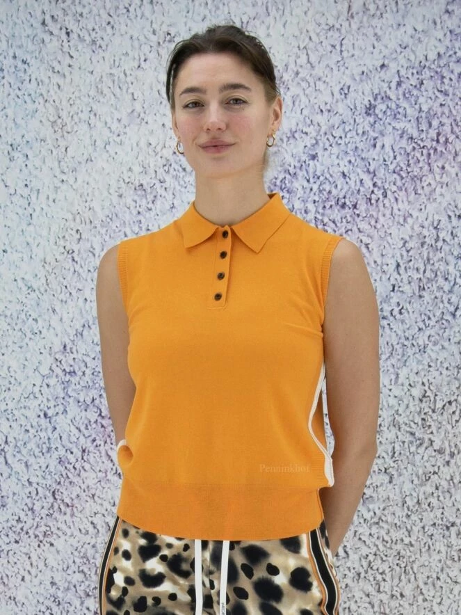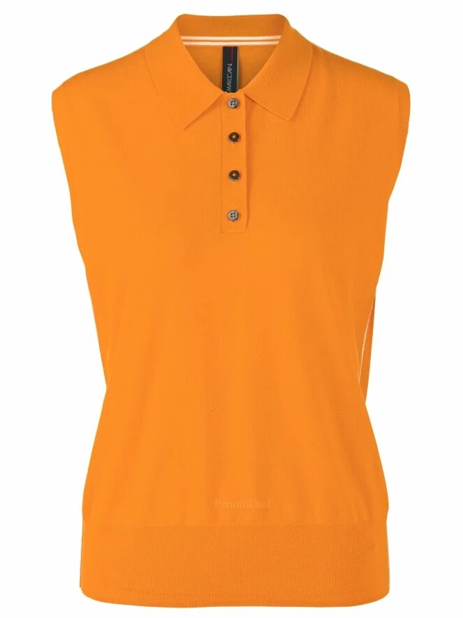 Polo sans manches de la marque Marc Cain, de couleur orange. Quatre boutons ferment le col à revers. Un passepoil blanc orne les côtés. Les emmanchures, les côtés et le bas du polo sont finement côtelés. Lavage à la main.