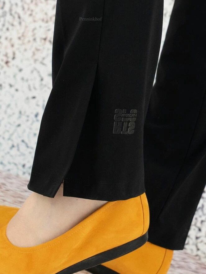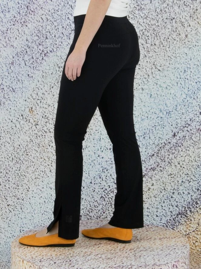 Pantalon de la marque Marc Cain, de couleur noire. La taille est équipée d’une large bande élastique. Les poches latérales ferment avec un zip à anneau. Une fente profonde d’1,5 cm au bas des jambes donne au pantalon une ampleur agréable. Lavage à 30 degrés.