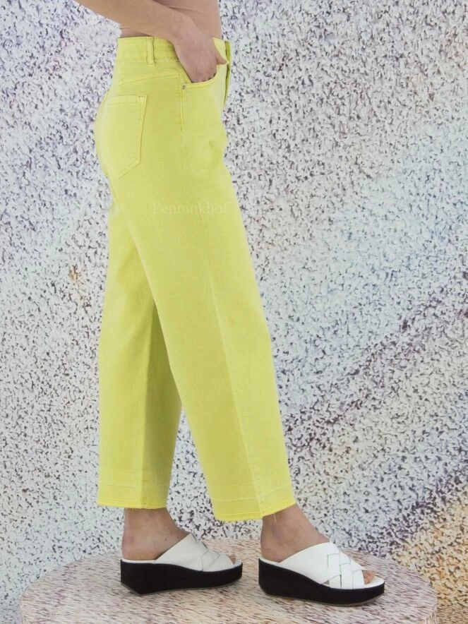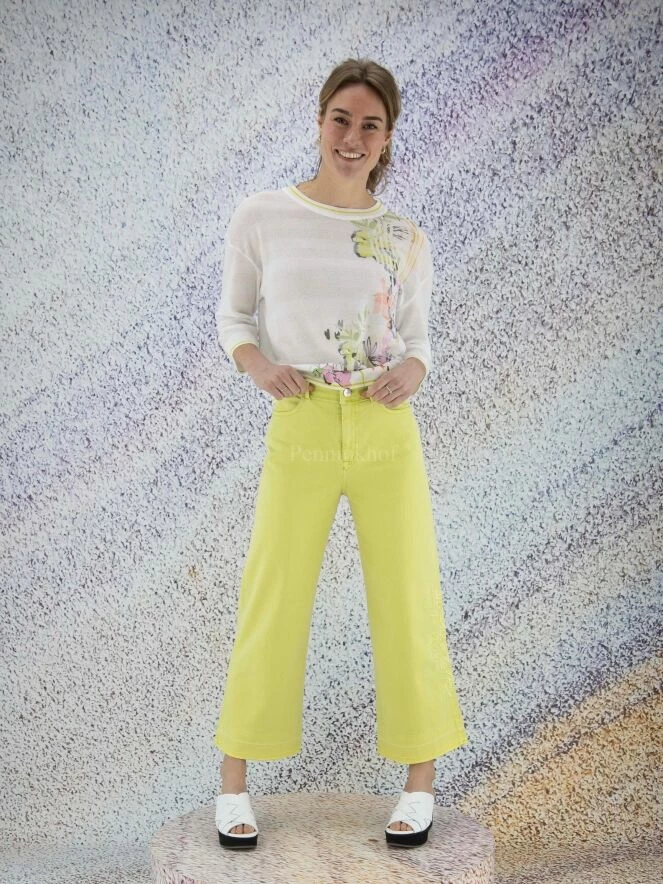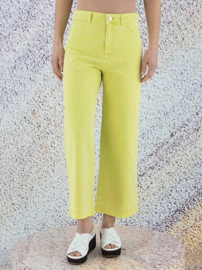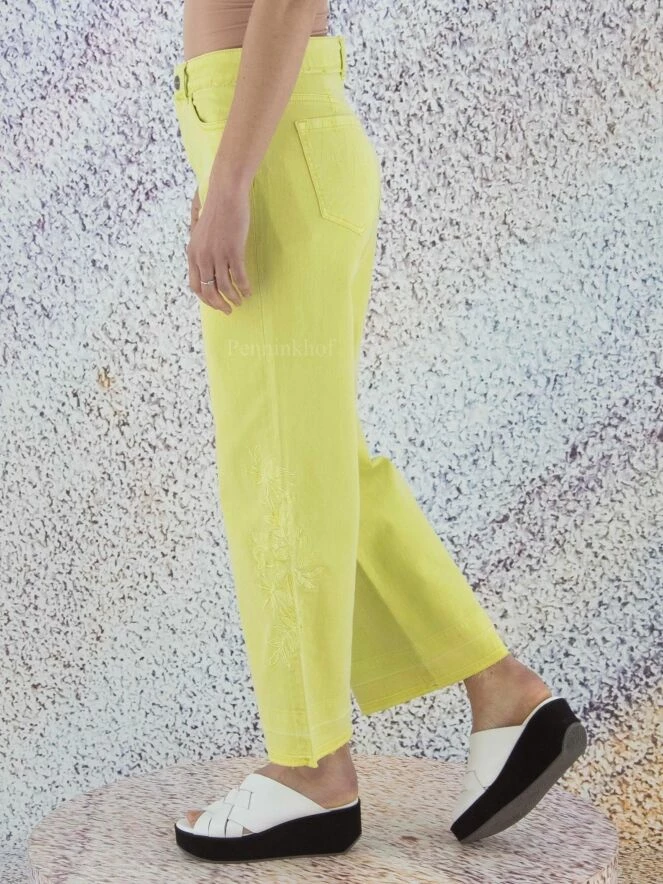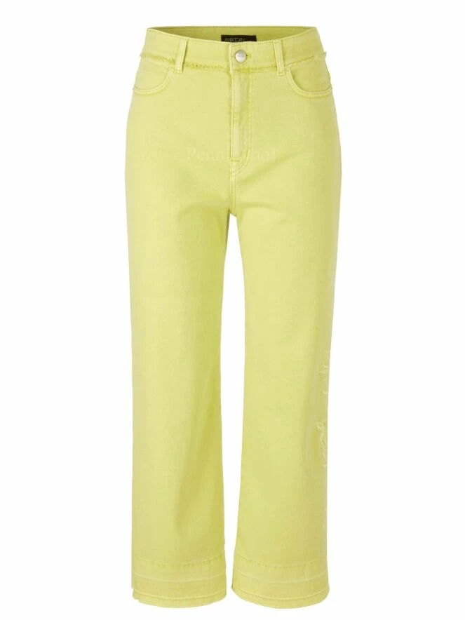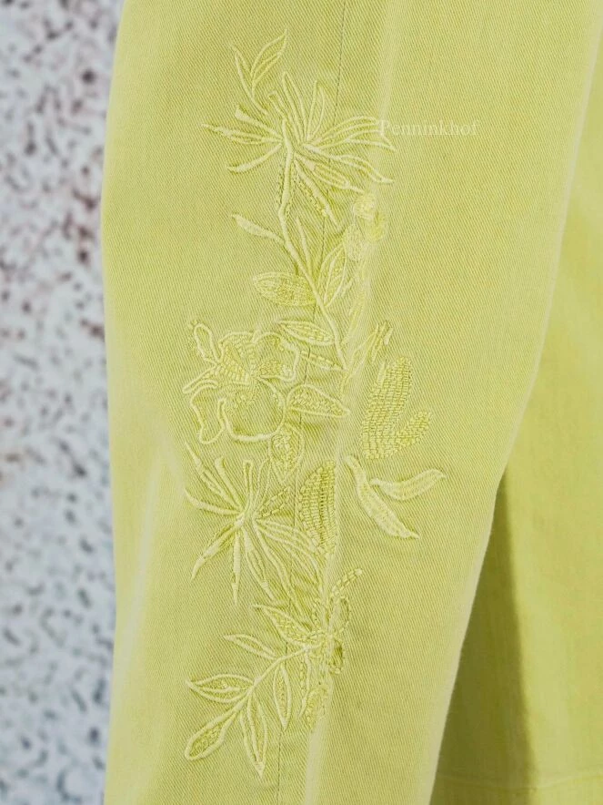 Jean à coupe droite de de la marque Marc Cain, de couleur vert lime. Le côté gauche est orné d’un grand motif floral brodé ton sur ton. Le bas de la ceinture et des jambes présente des coutures aux bords finement frangés. Lavage à 30 degrés.