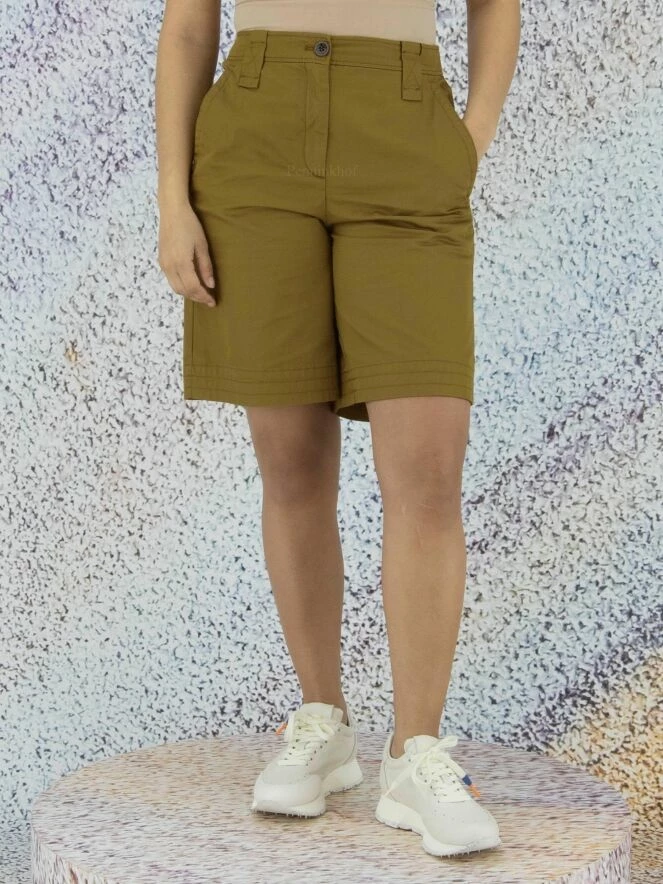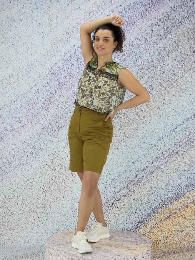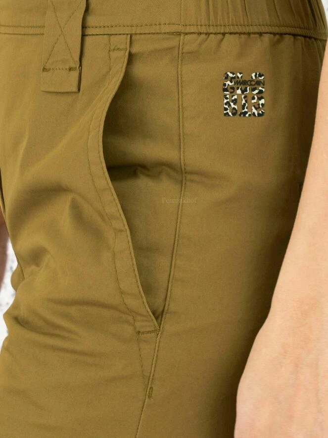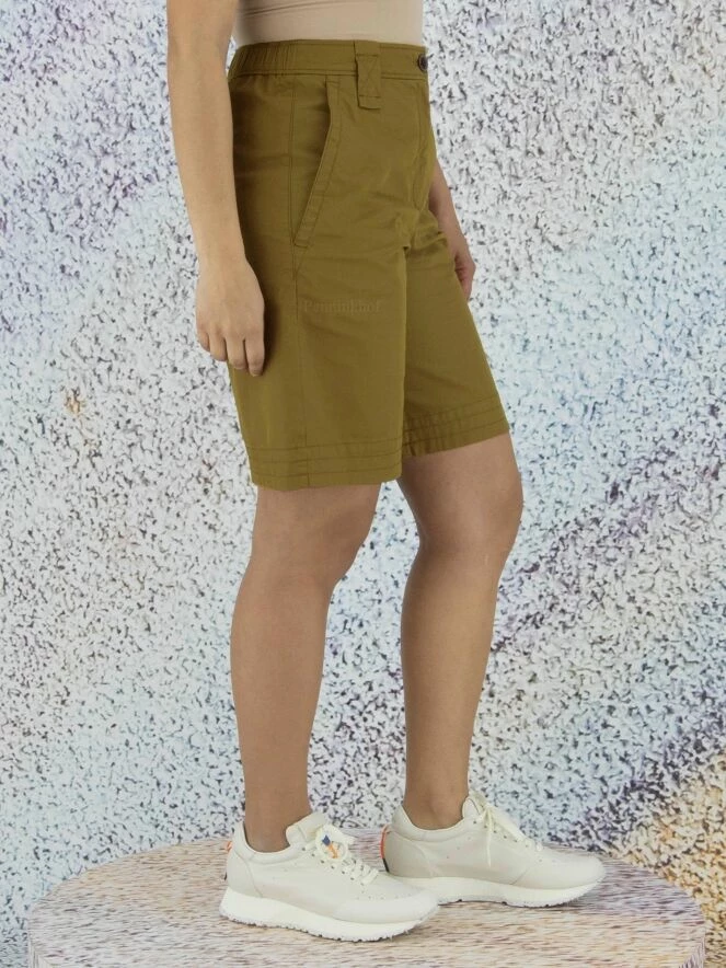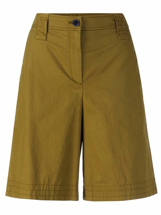 Bermuda de la marque Marc Cain, de couleur vert olive. La taille est équipée d’un élastique intégré dans le dos. Le bermuda est doté de poches latérales et peut être lavé à 30 degrés.
