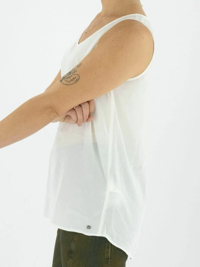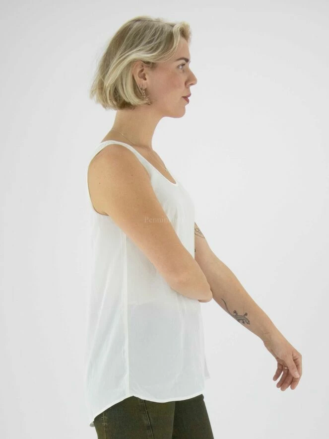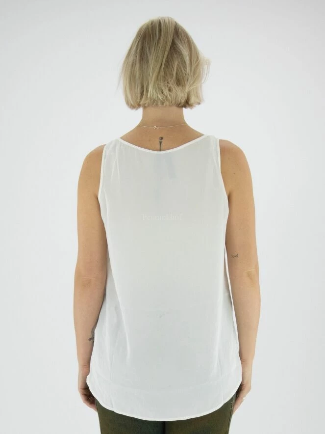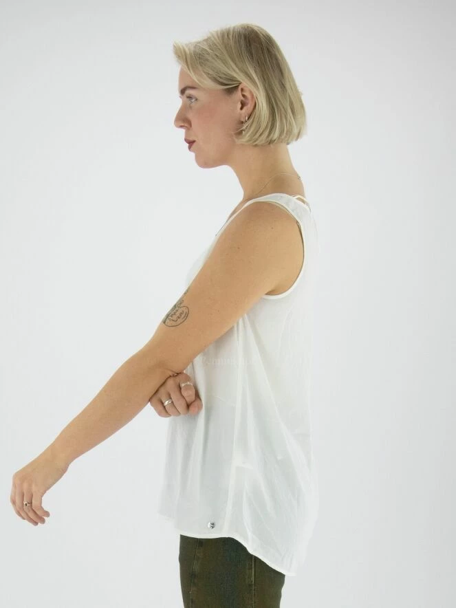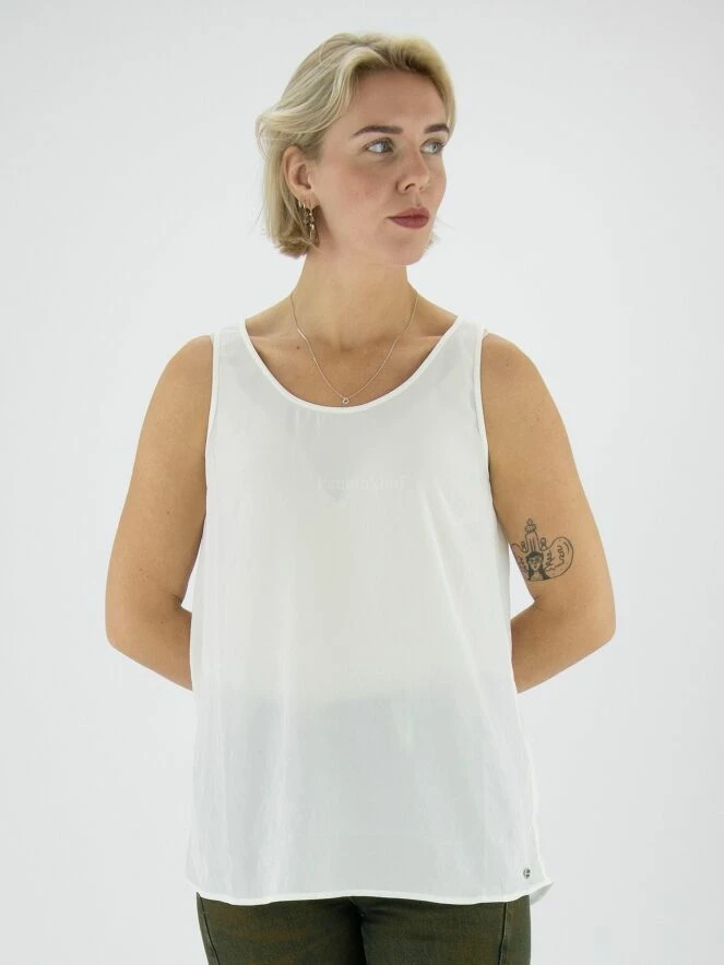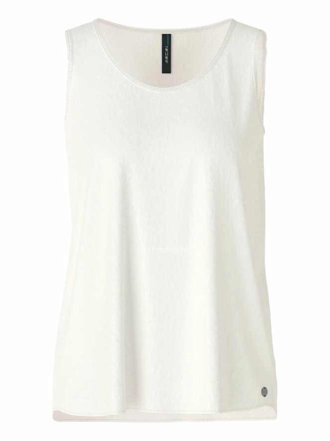 Top Marc Cain en tissu lisse et mat de couleur blanc crème. Le top a une encolure ronde et peut être lavé à 30 degrés.