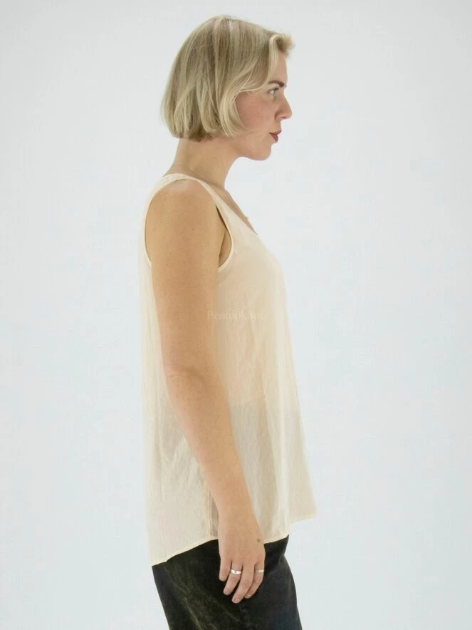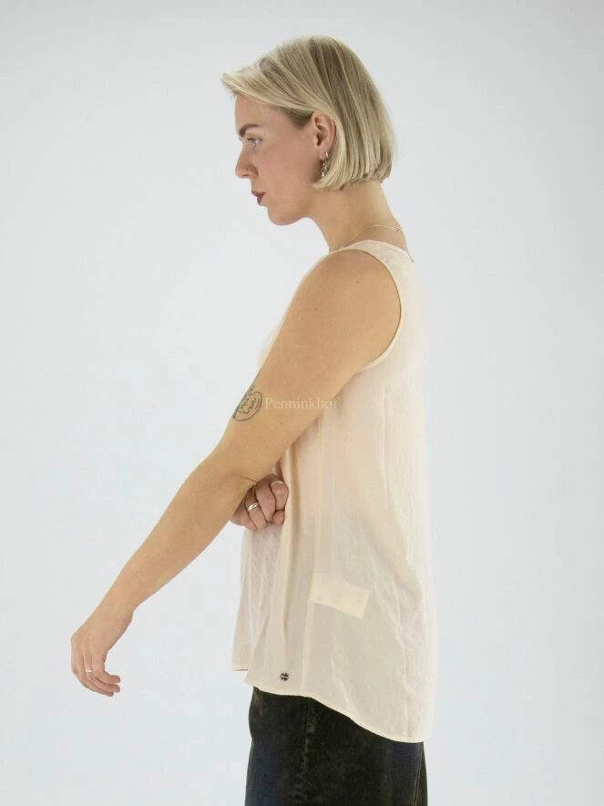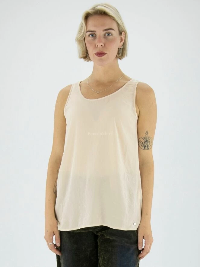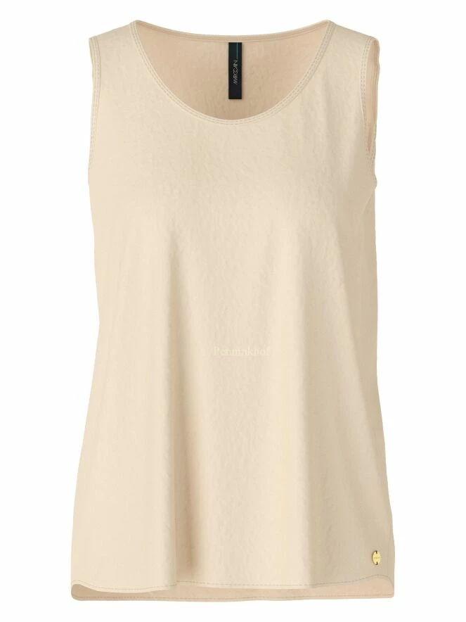 Top de Marc Cain en tissu lisse et mat de couleur sable. Le top a une encolure ronde et peut être lavé à 30 degrés.