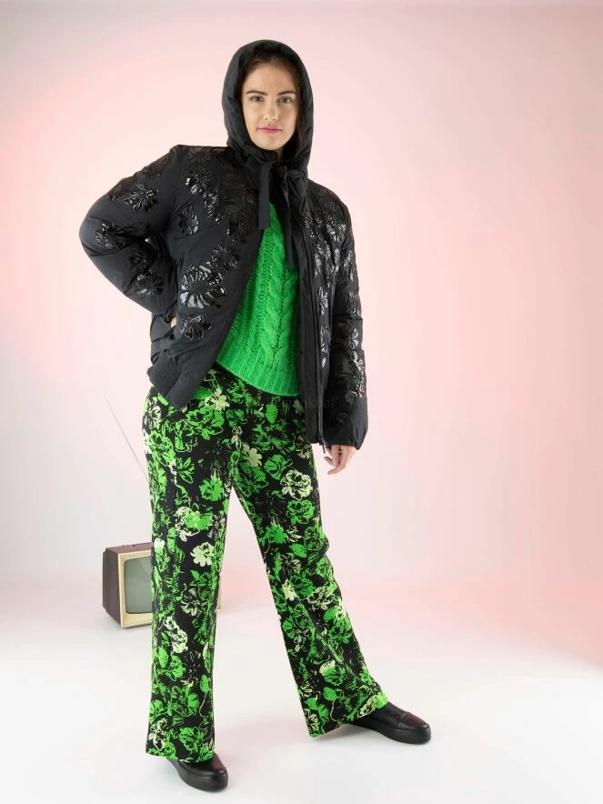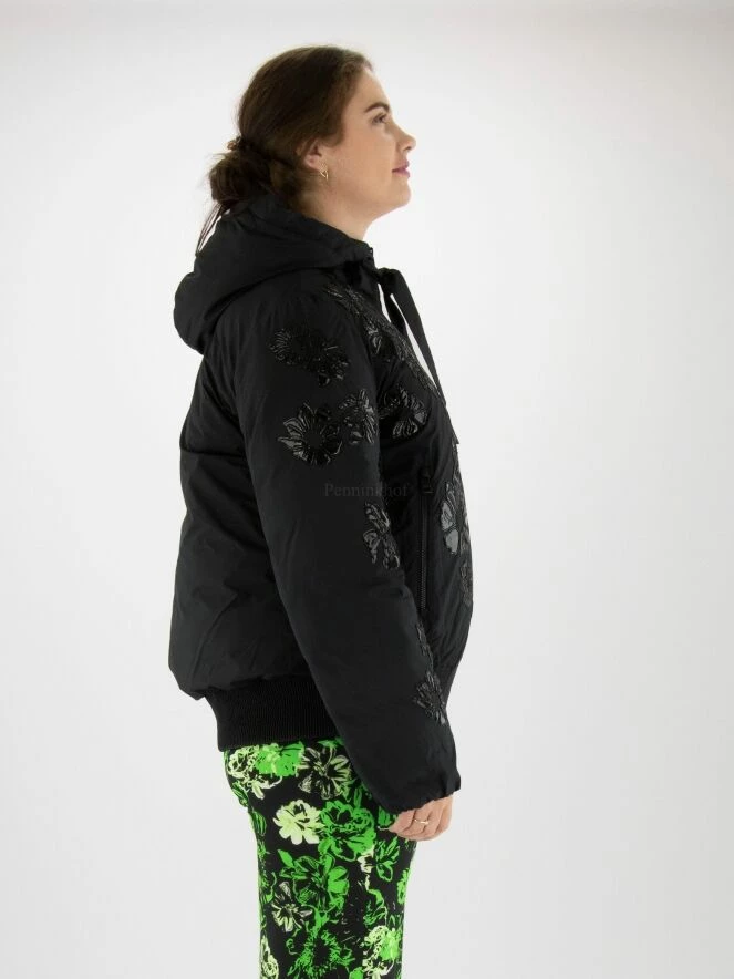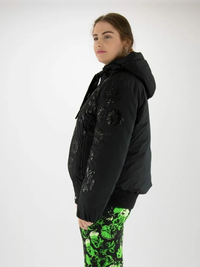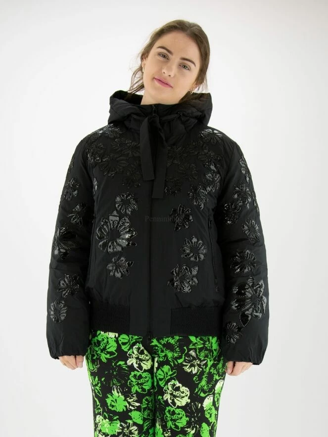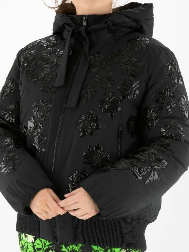 Une doudoune de Marc Cain de couleur noire. Des fleurs sont attachées au tissu verni noir. Sur le bord de la capuche se trouve un ruban permettant de resserrer la capuche. En bas, il y a un ourlet large élastique et finement côtelé. La doudoune peut être lavée à 30 degrés.