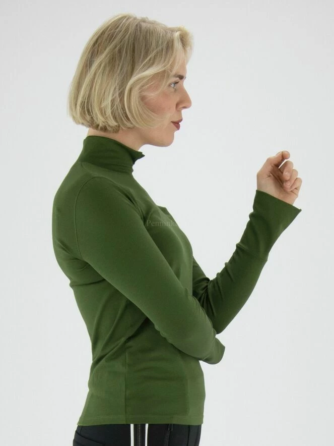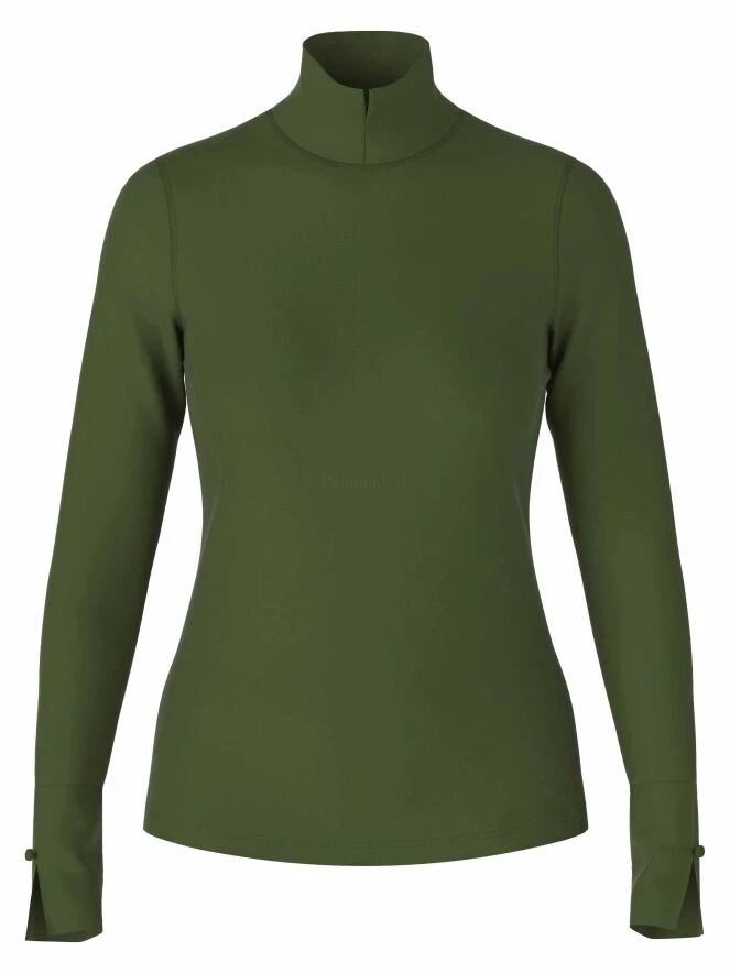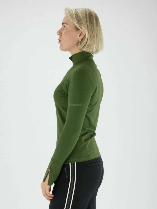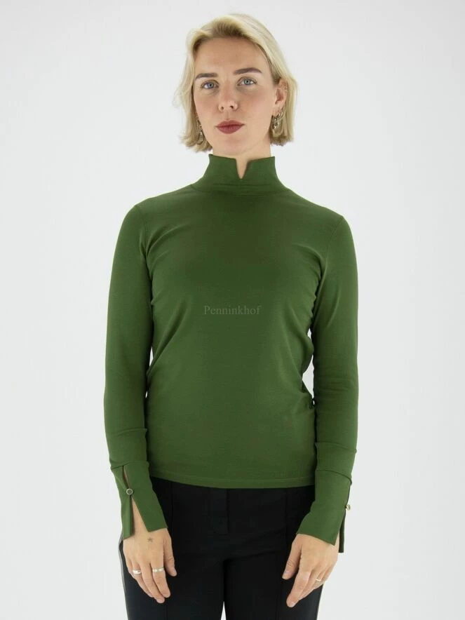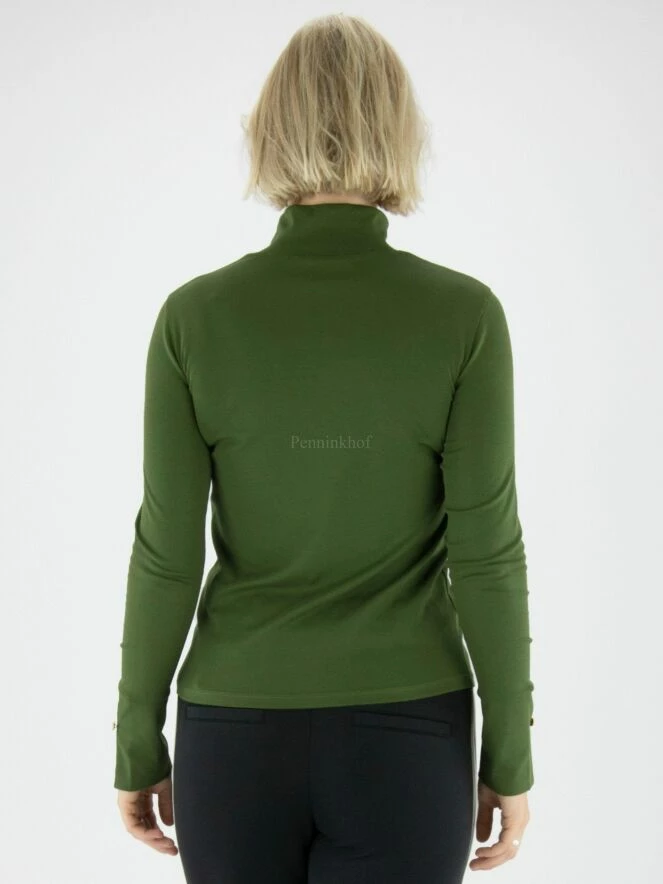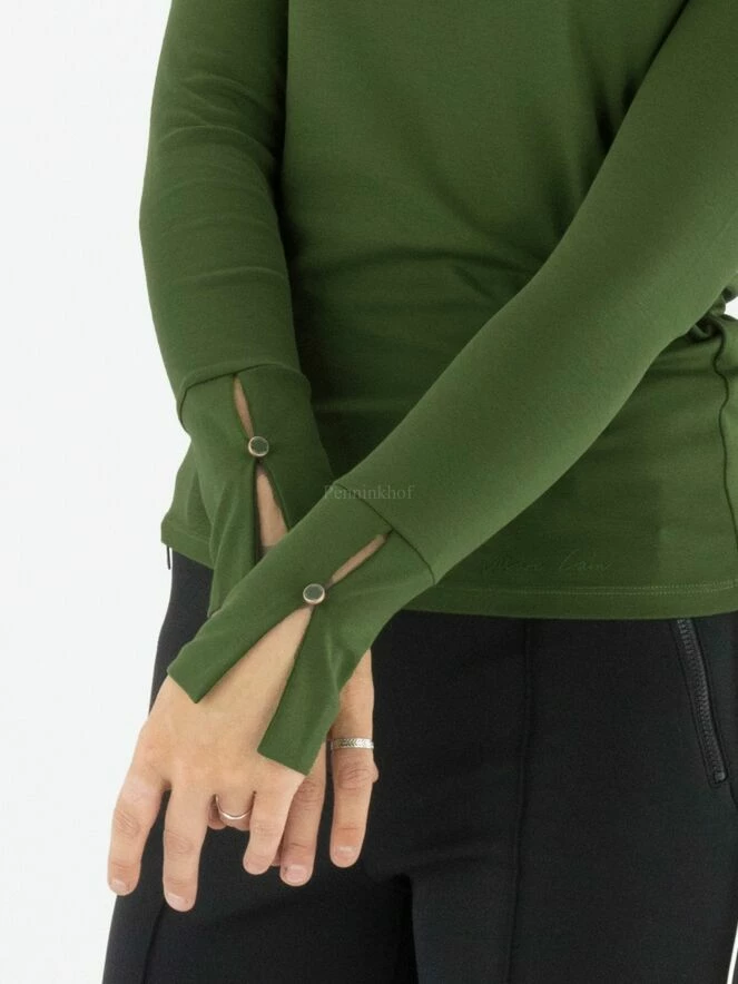 Une chemise de Marc Cain de couleur verte. La chemise a un col roulé avec une fente au milieu. Les manches longues de la – shirt ont des poignets avec un bouton décoratif. Cette T shirt peut être lavée à 30 degrés.