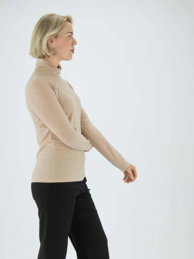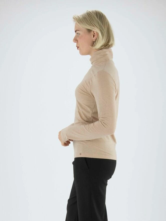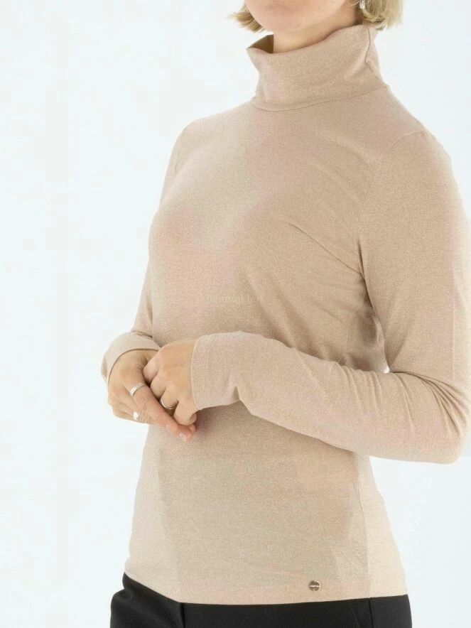 Une T – shirt de Marc Cain dans le coloris beige. Un fil dorĂ© est tissĂ© dans le tissu. La T – shirt a un col roulĂ© tombant et des manches longues. Cette T shirt peut ĂŞtre lavĂ©e Ă 30 degrĂ©s.