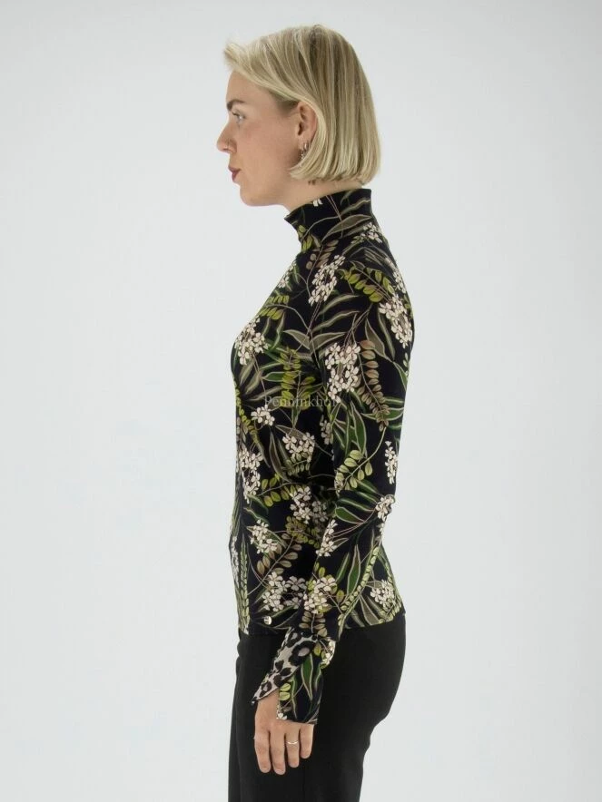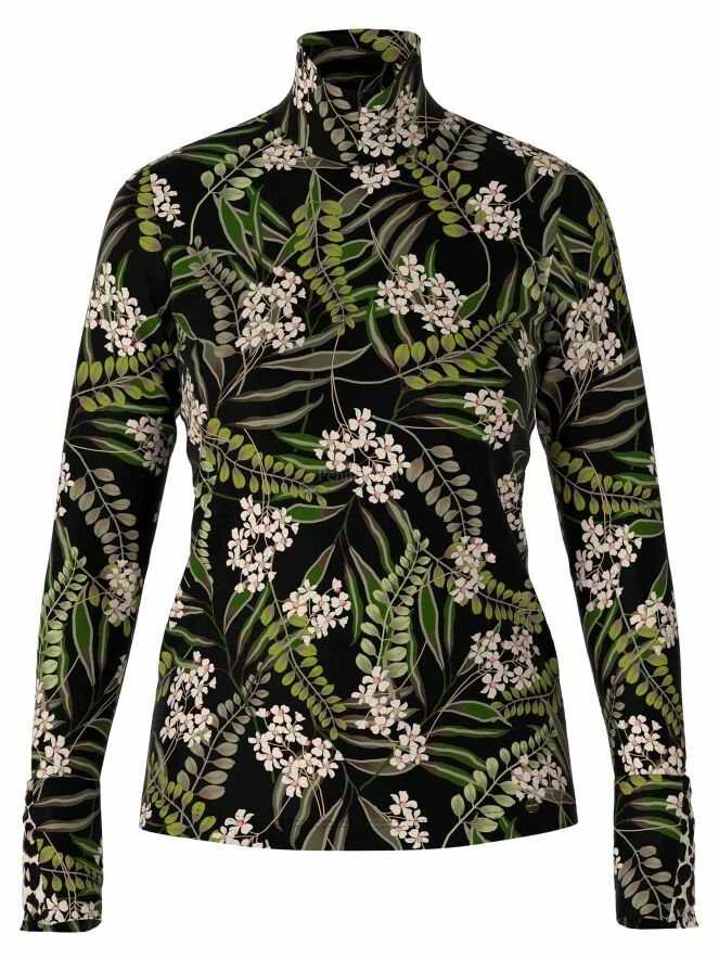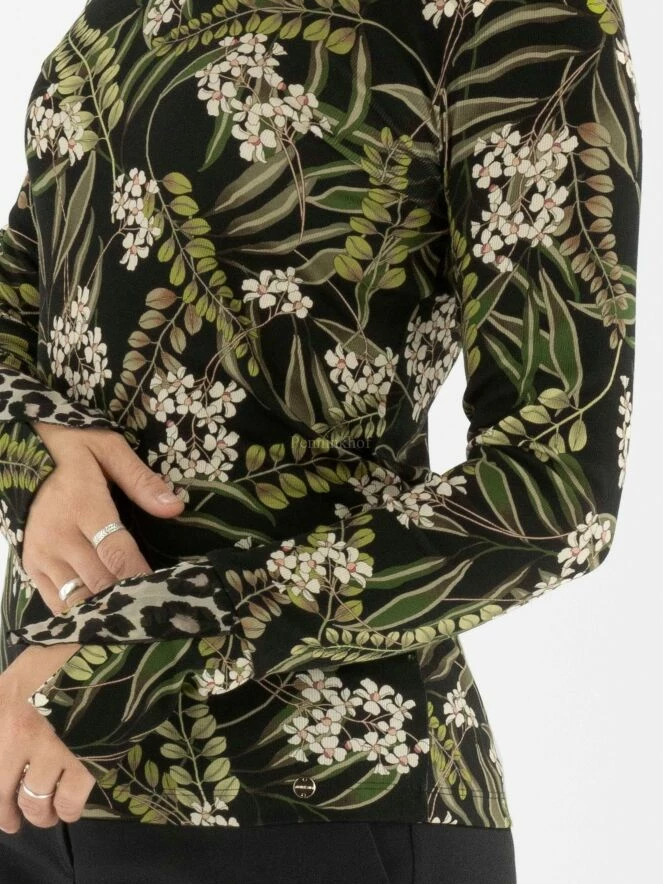 T shirt Marc Cain en imprimé muguet aux multiples nuances de vert avec du blanc crème sur fond noir. La T – shirt a un col roulé et des manches longues. Cette T shirt peut être lavée à 30 degrés.