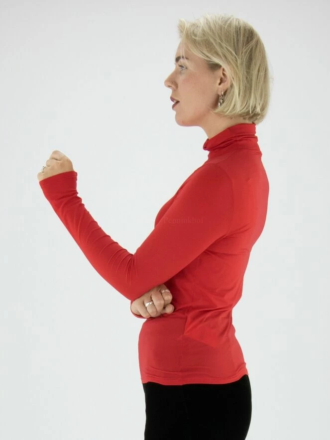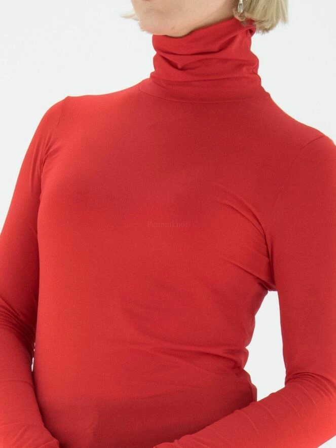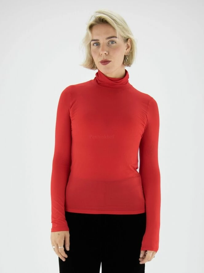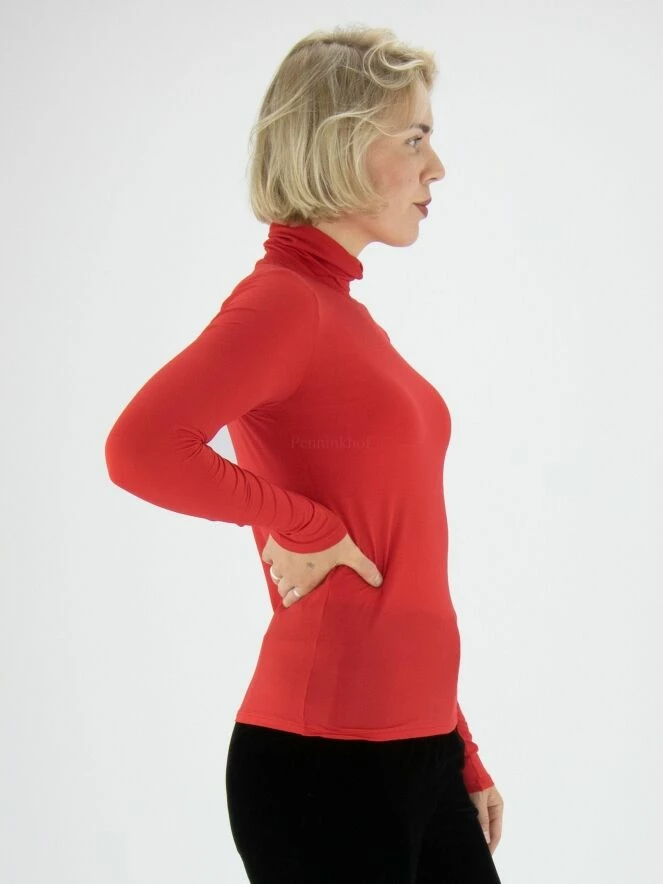 Une chemise à collants de Marc Cain de couleur rouge. La T – shirt a un col roulé et des manches longues et peut être lavée à 30 degrés.