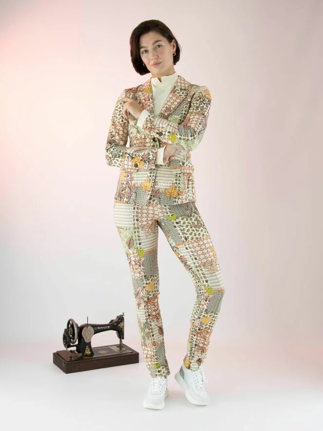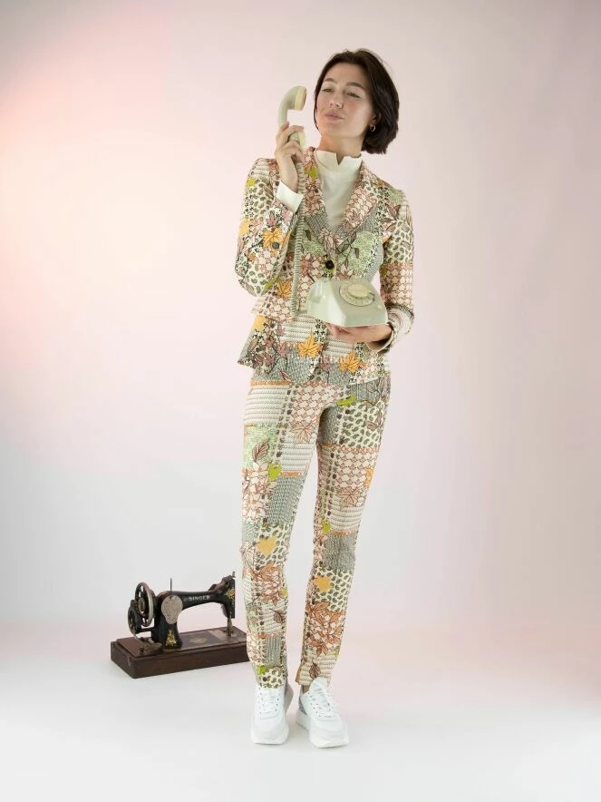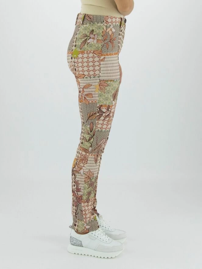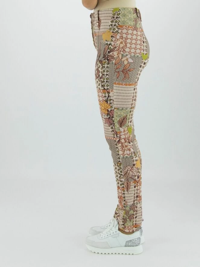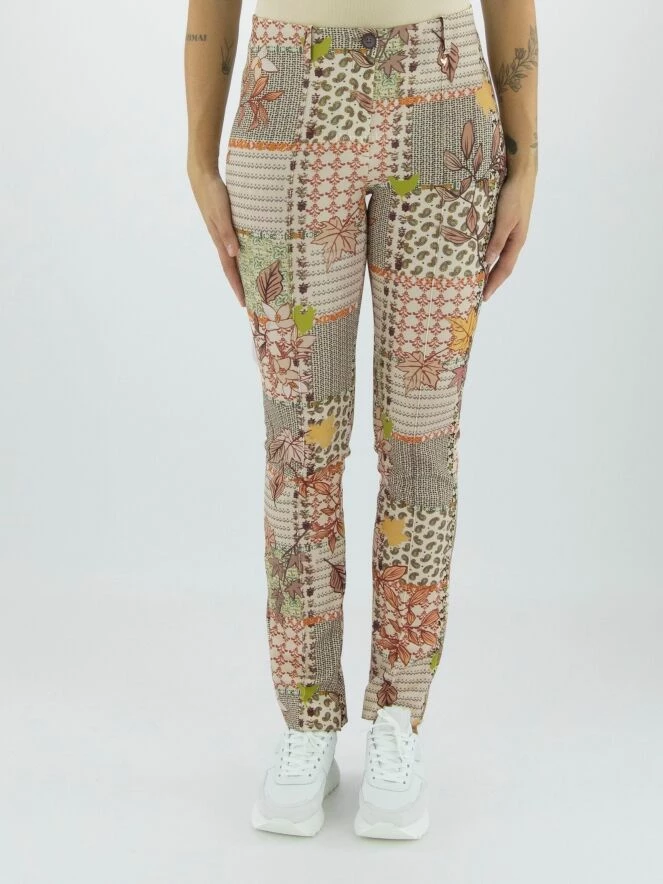 Pantalon Marc Cain avec un imprimé graphique aux multiples motifs, dont les couleurs principales sont le camel, le vert rouille et le blanc crème. La taille est élastiquée. Au milieu des jambes se trouve une couture inversée. Ce pantalon peut être lavé à 30 degrés.