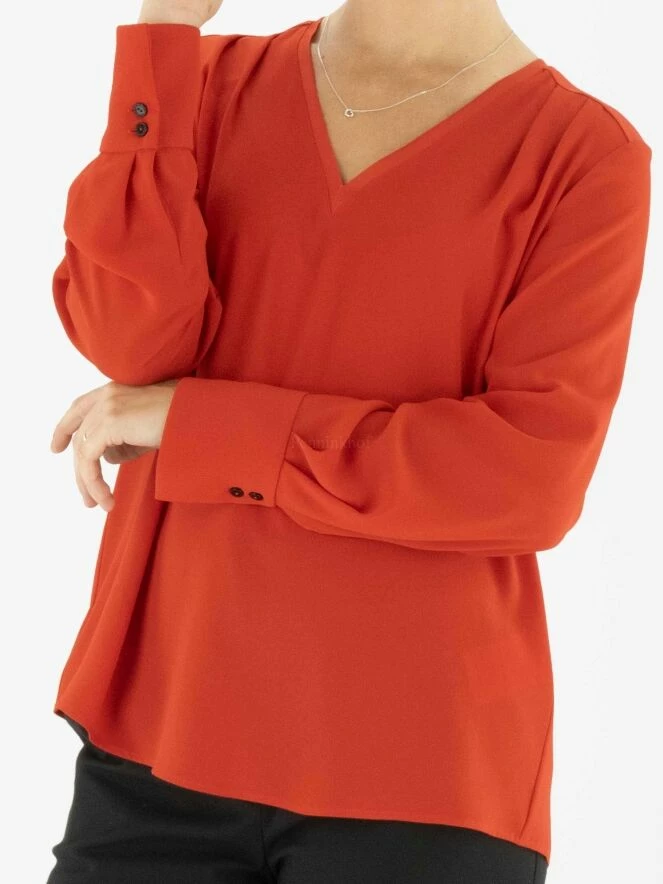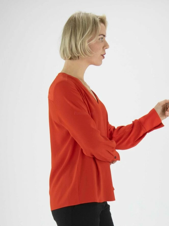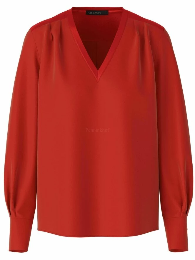 T shirt en satin mat de Marc Cain de couleur rouge. La T – shirt a un col en V et aux épaules il y a 2 plis des deux côtés de la couture. Cette T shirt peut être lavée à 30 degrés.