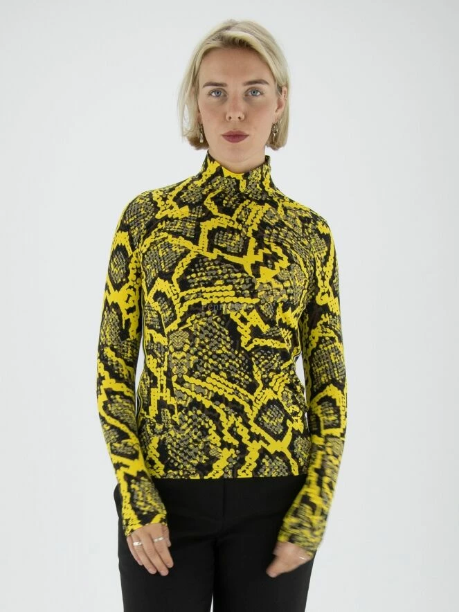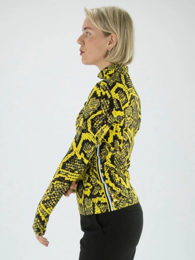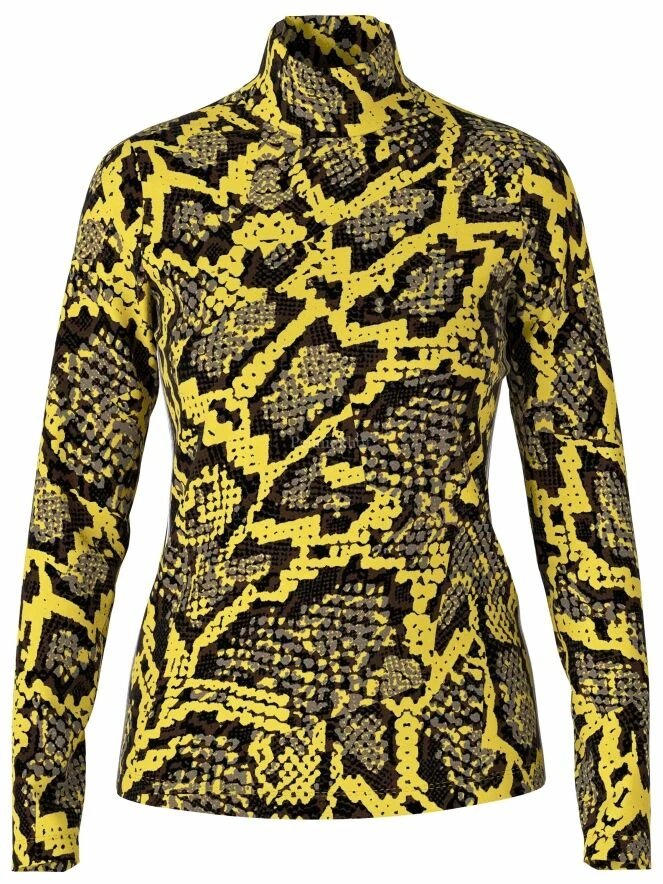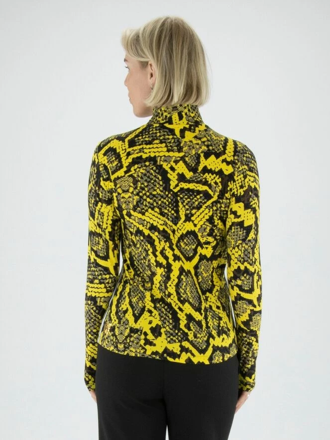 Une shirt Marc Cain en imprimé reptile avec des couleurs jaunes, grises et noires. La shirt a un col roulé. Le long des côtés se trouve un passepoil à rayures aux couleurs lilas, blanc et noir. Cette T shirt peut être lavée à 30 degrés.