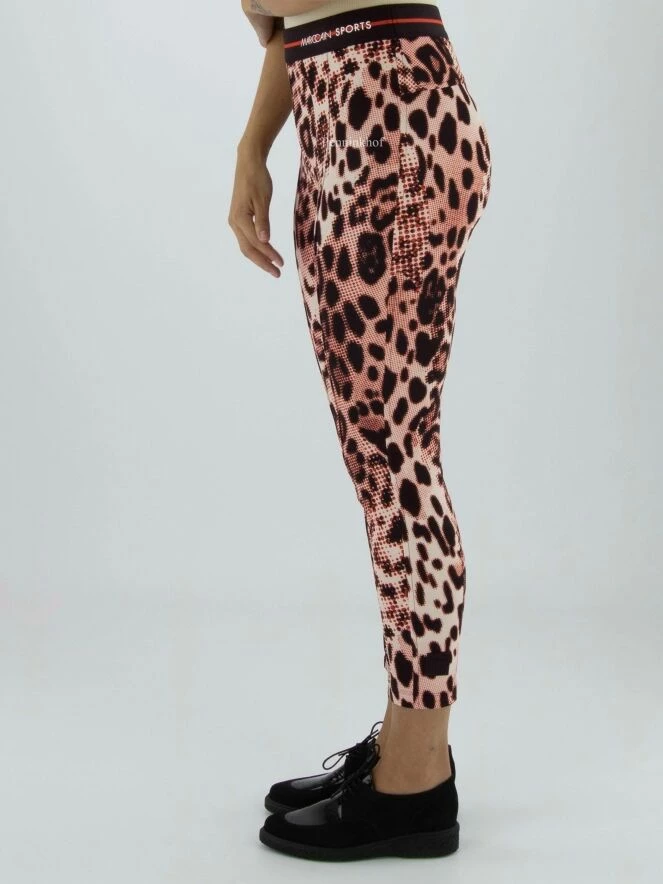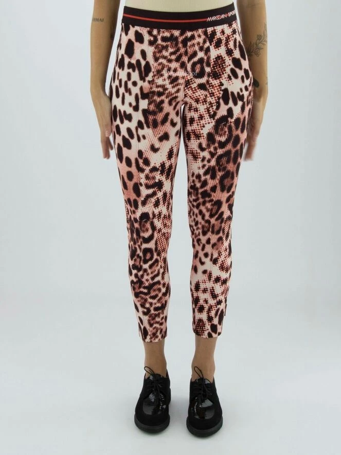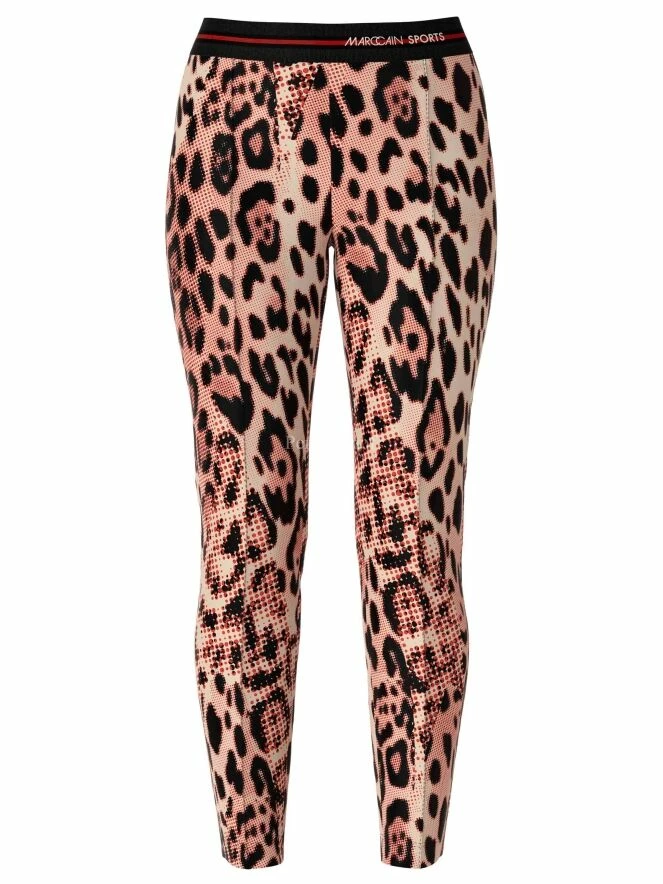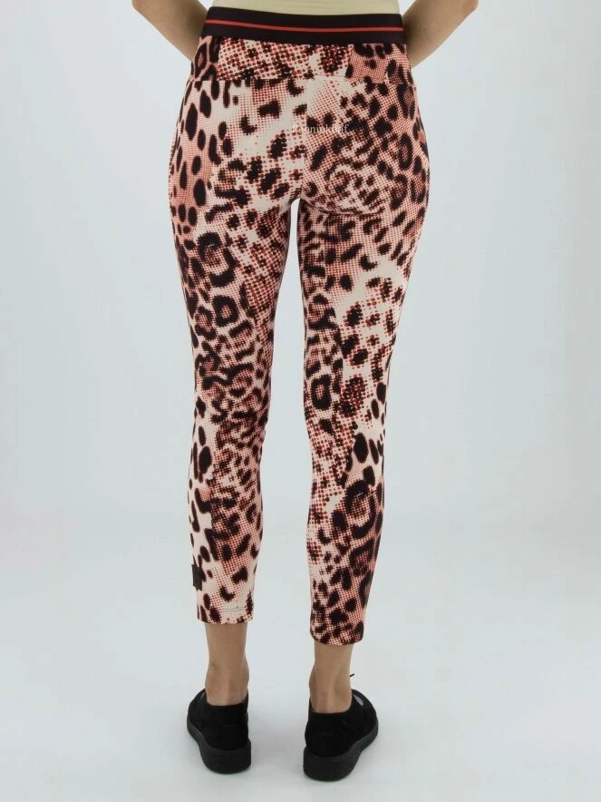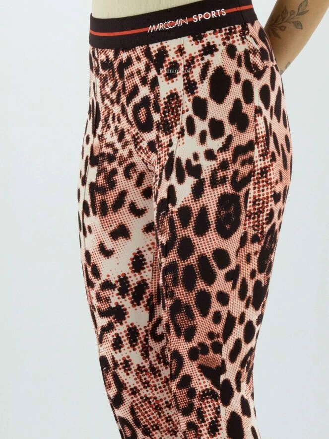Pantalon Marc Cain à imprimé graphique panthère aux couleurs rouge, blanc crème et noir. Il y a une bande élastique noire à la taille. Ce pantalon peut être lavé à 30 degrés.