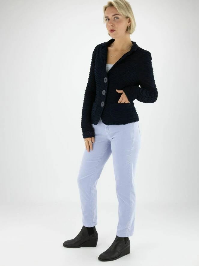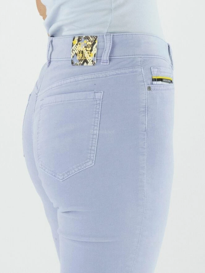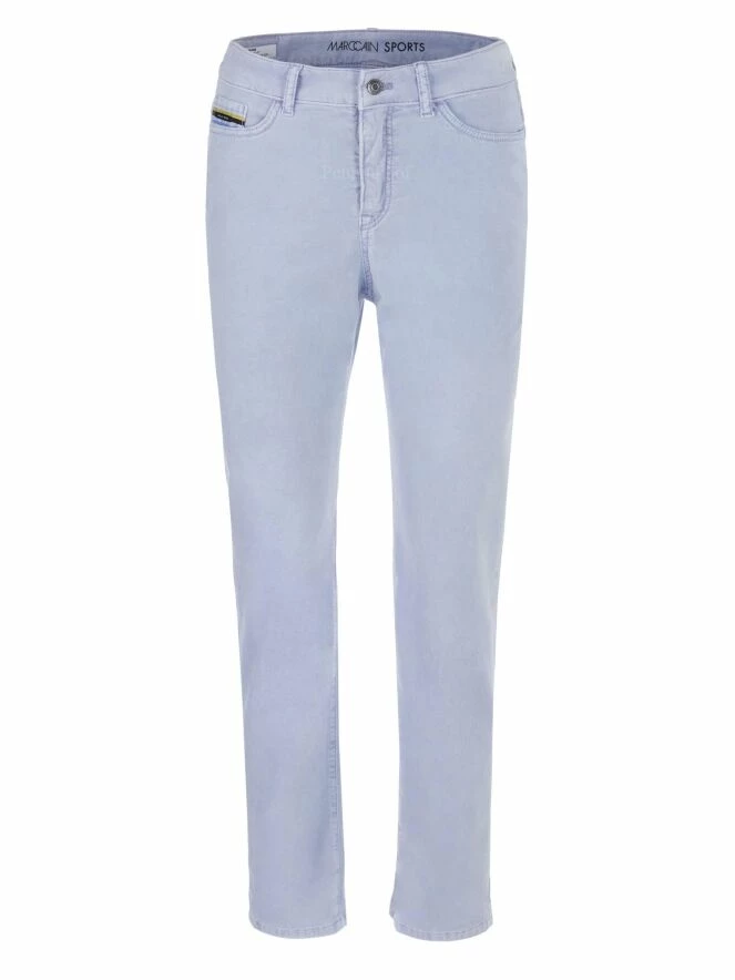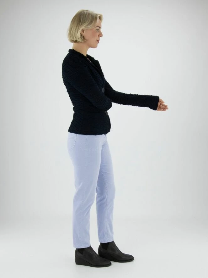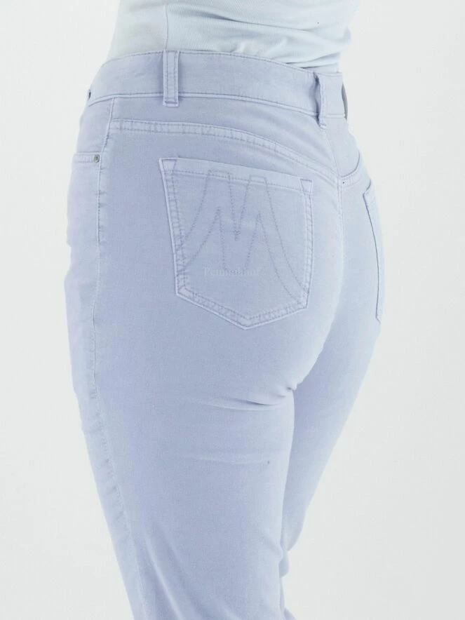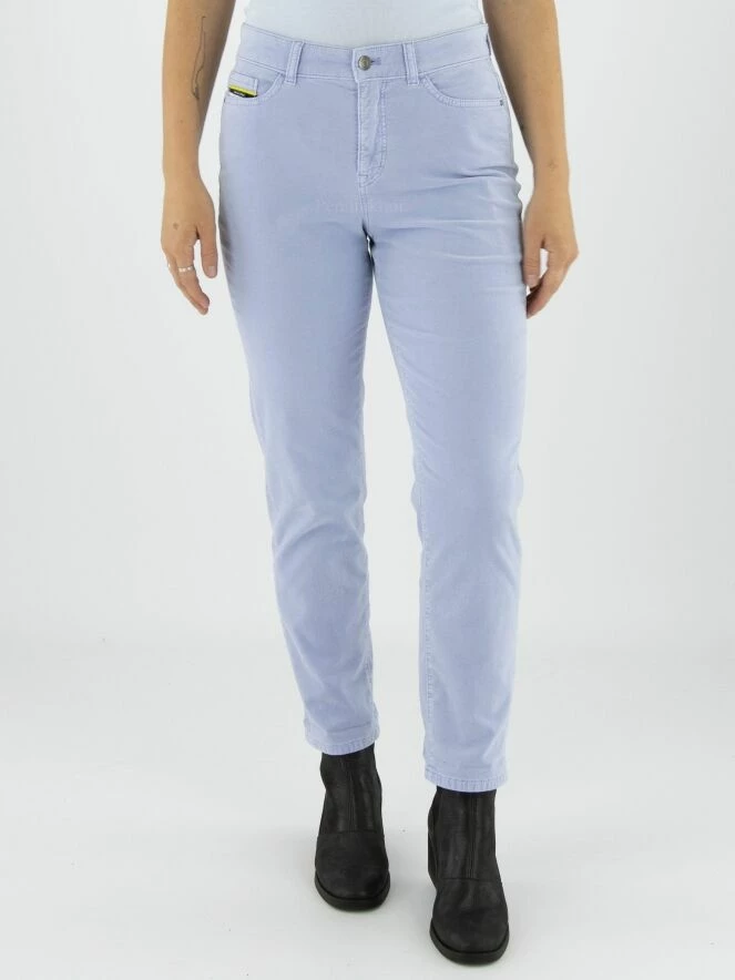 Pantalon en velours de Marc Cain de couleur lilas. Le pantalon a 5 poches. Il y a un petit revers au bas du pantalon. Ce pantalon peut être lavé à 30 degrés.