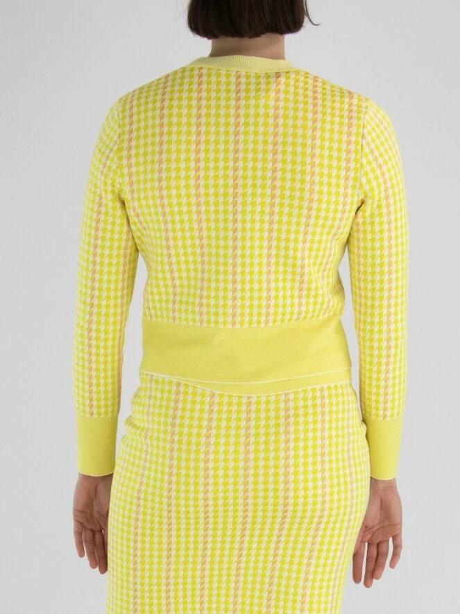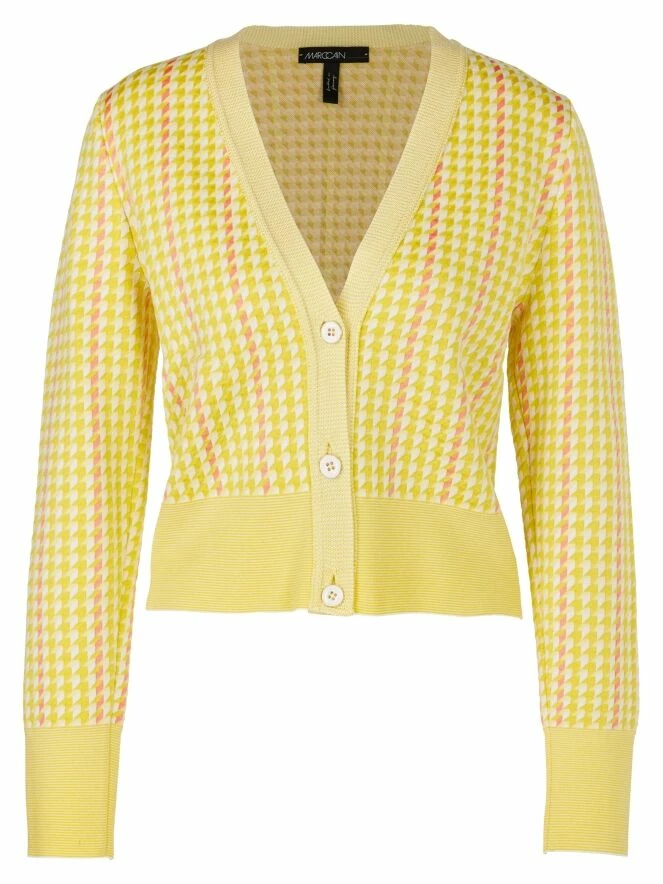 Un cardigan court de Marc Cain dans un imprimé graphique avec plusieurs nuances de jaune, blanc et orange. Le long du bord de l’encolure en V se trouve une garniture mouchetée qui se poursuit le long de la fermeture vers le bas. En bas et à l’extrémité des manches longues, il y a une bordure en tricot doux avec un motif de fines rayures. Ce cardigan peut être lavé à 30 degrés.