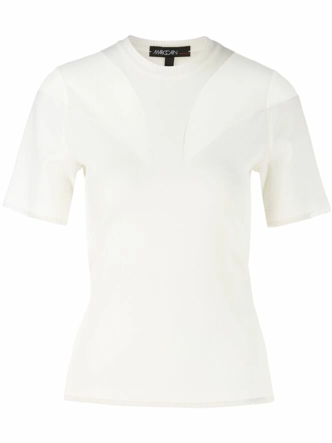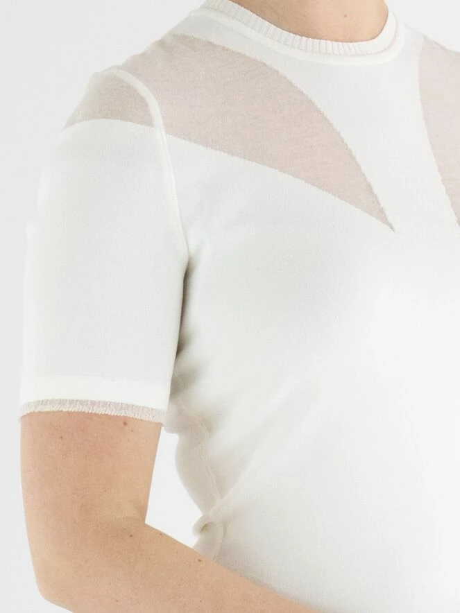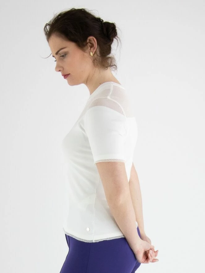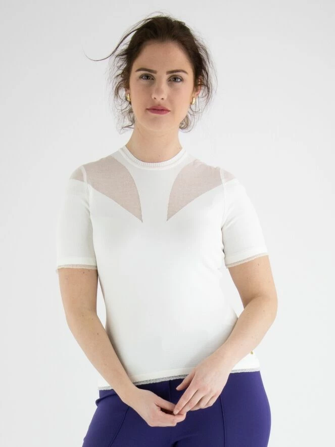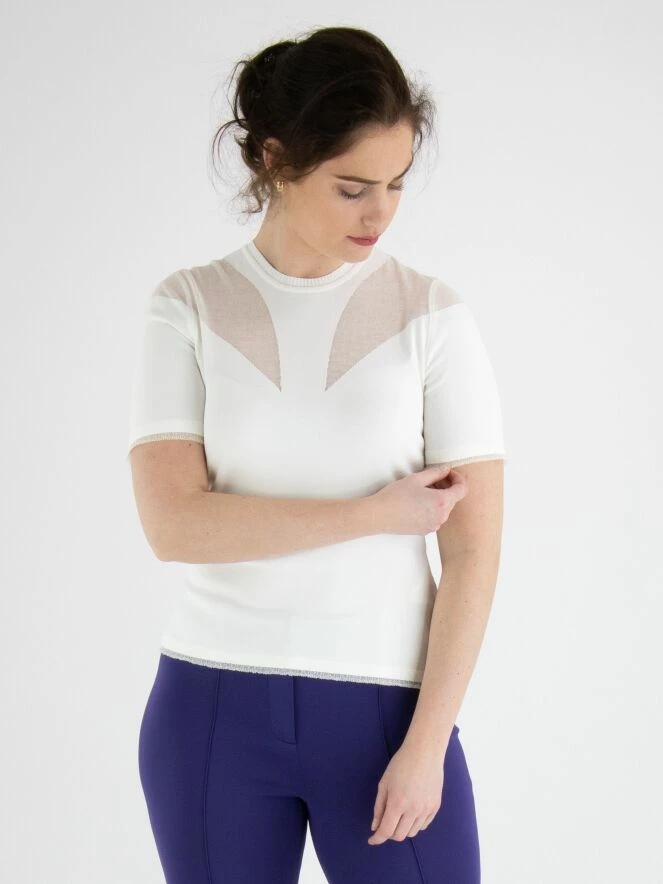 Un T-shirt de Marc Cain de couleur blanc crème. Le T-shirt a un col rond haut avec une finition en tricot finement côtelé. Le tissu est légèrement transparent en forme de goutte des épaules à la poitrine à l’avant, et à l’arrière, le tissu transparent s’étend jusqu’aux omoplates. Il y a une finition transparente finement plissée en bas. Ce T-shirt peut être lavé à 30 degrés.