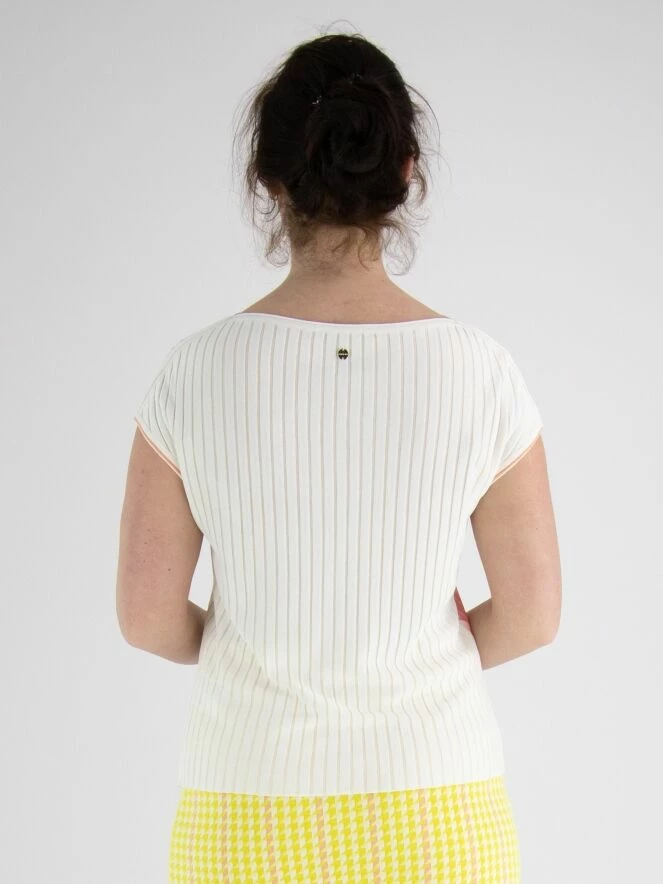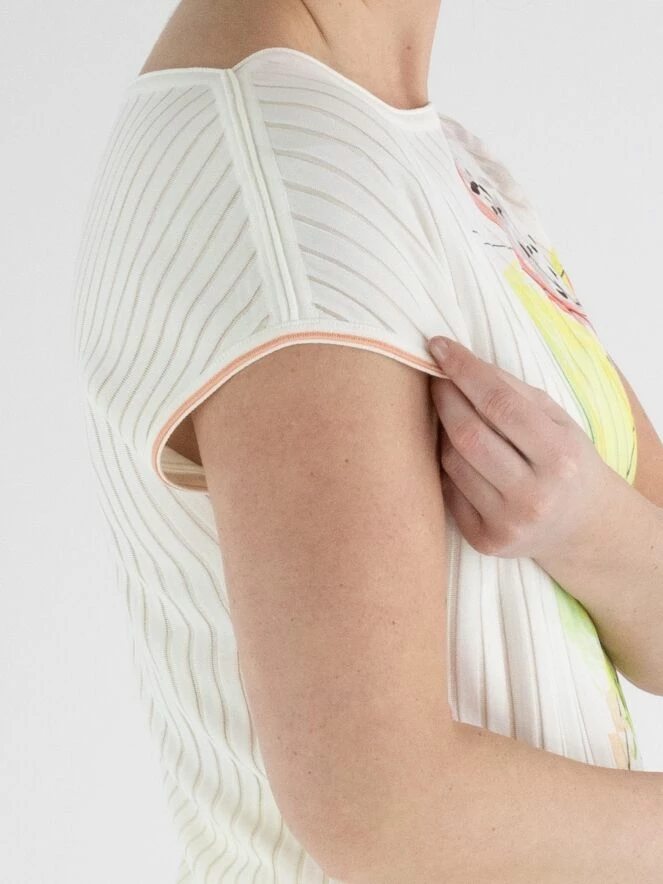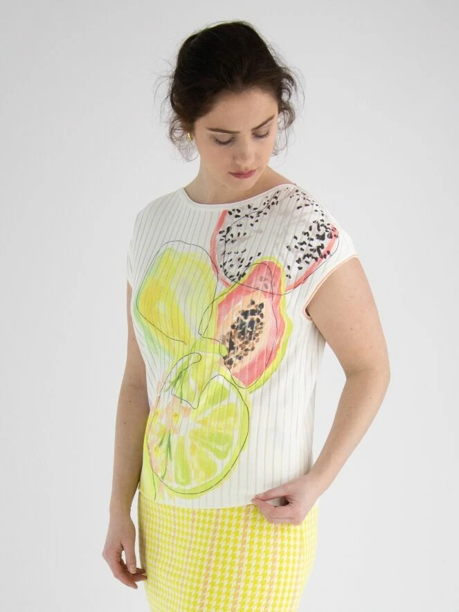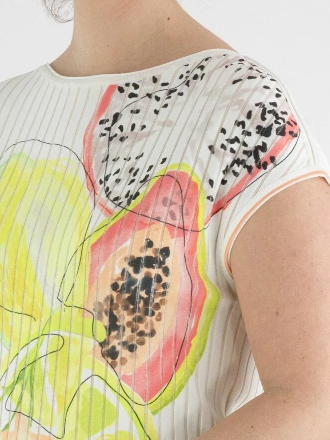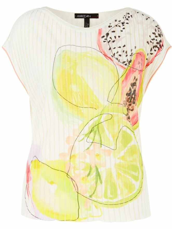 Un gilet de Marc Cain dans une structure côtelée large avec du tissu en voile dans les espaces entre les côtes. Le gilet arbore une impression de citrons verts et de pastèques dans plusieurs nuances de vert citron et de rouge corail sur fond blanc. Il y a une bordure rouge corail le long des emmanchures. Ce gilet peut être lavé à 30 degrés.