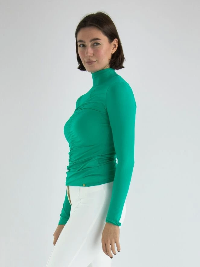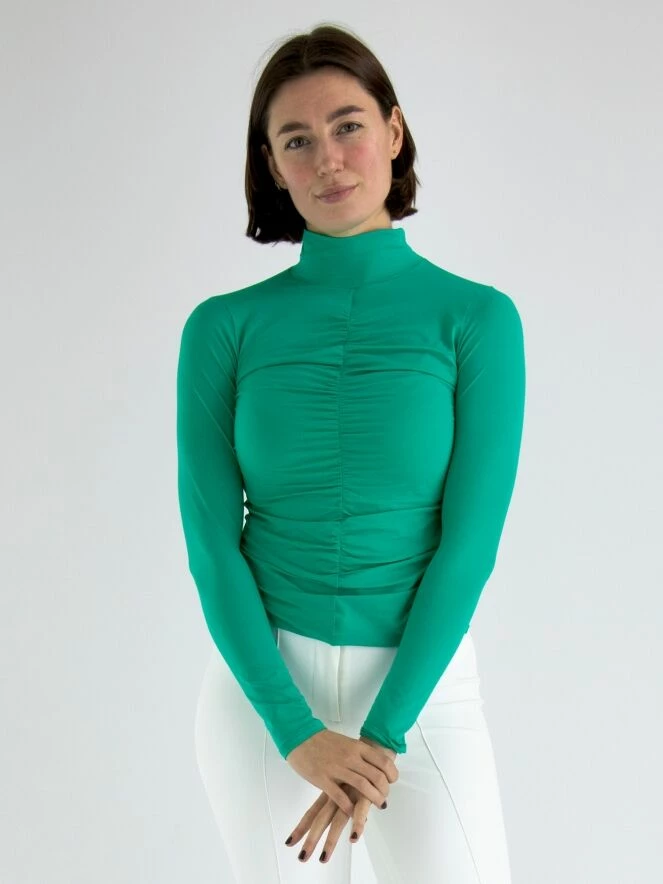 Un chemisier tunique de Marc Cain en turquoise. Au milieu du devant, il y a une couture le long de laquelle le tissu est finement plissé. Le chemisier a un col montant et peut être lavé à 30 degrés.