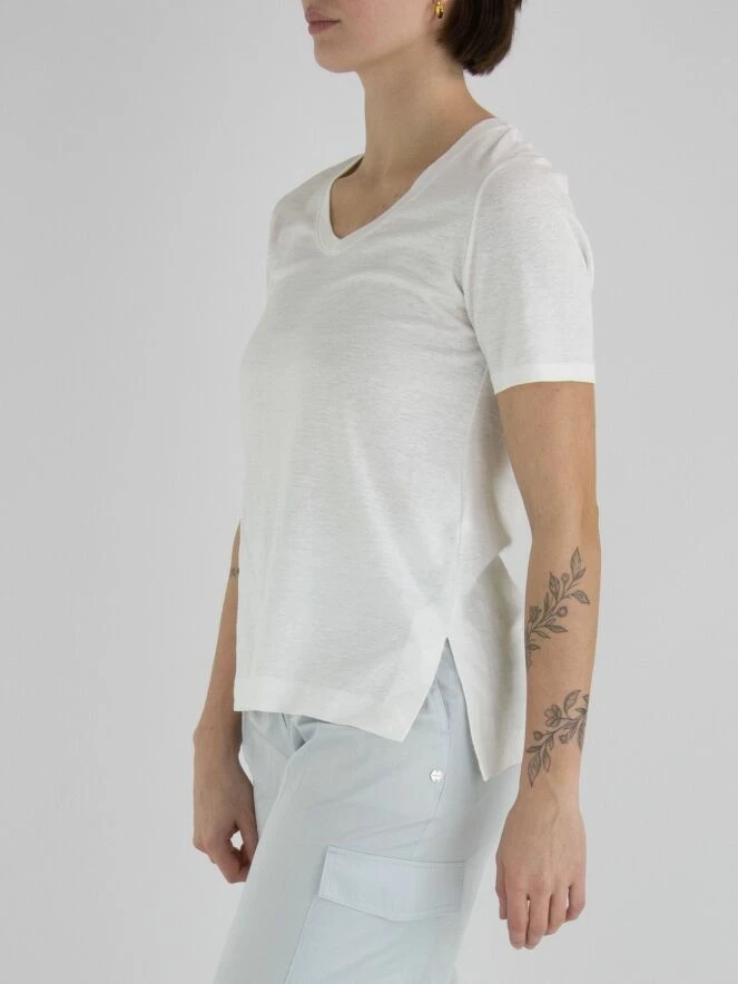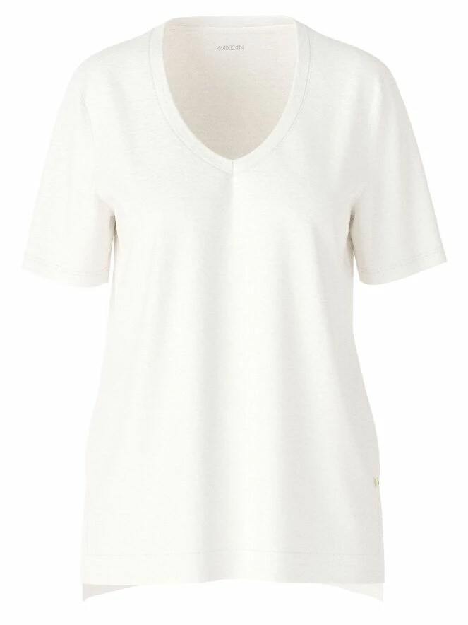 Un chemisier de Marc Cain de couleur blanche. Le chemisier présente un col en V coupé rond et des manches courtes. Il y a une courte fente de chaque côté en bas. Ce chemisier peut être lavé à 30 degrés.