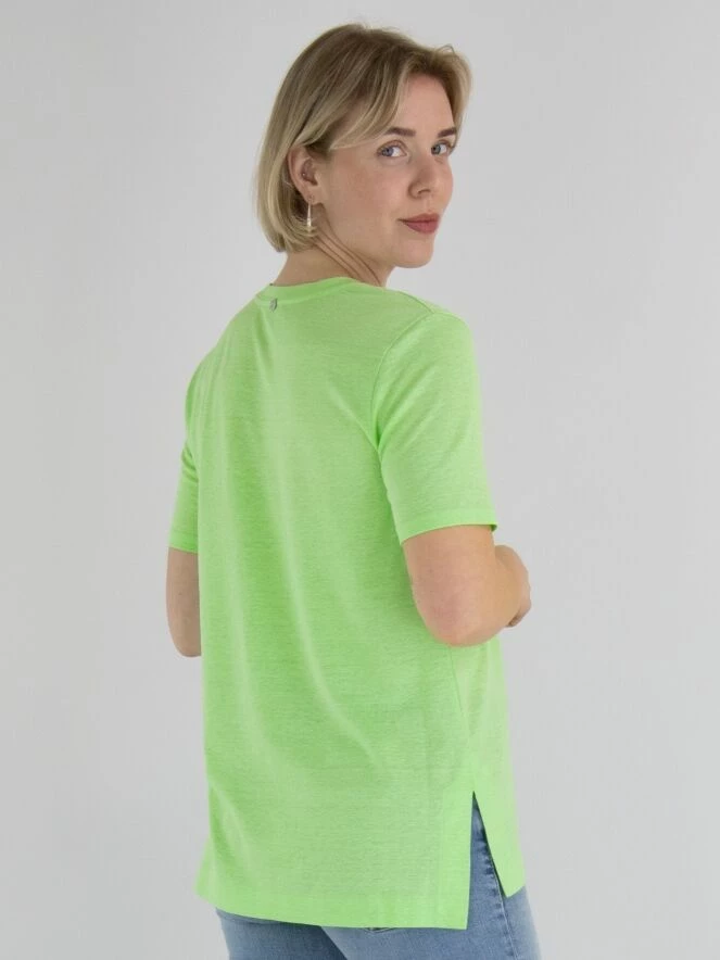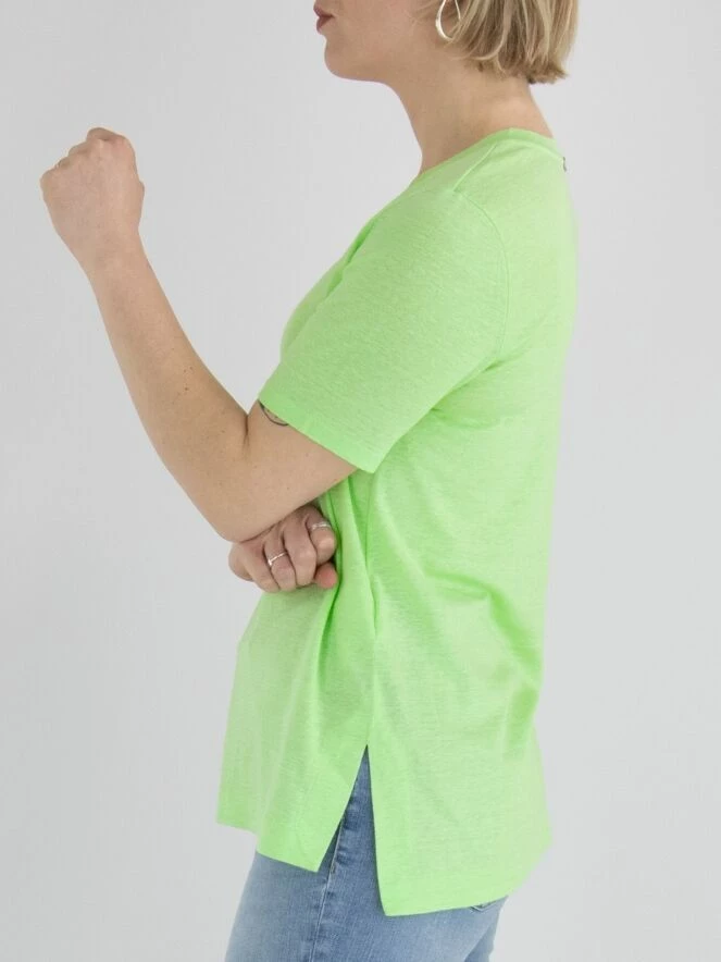 Un chemisier de Marc Cain de couleur vert pistache. Le chemisier présente un col en V coupé rond et des manches courtes. Il y a une courte fente de chaque côté en bas. Ce chemisier peut être lavé à 30 degrés.
