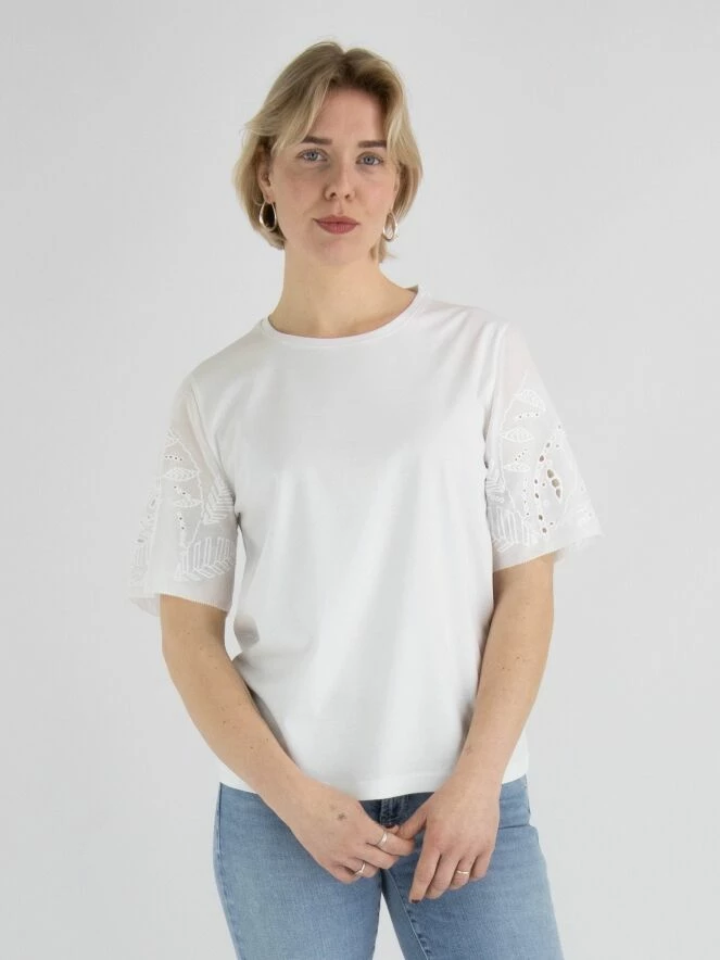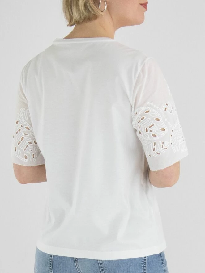 Un chemisier de Marc Cain en blanc. Les manches courtes sont dans une structure en dentelle. Le chemisier a un col rond et peut être lavé à 30 degrés.