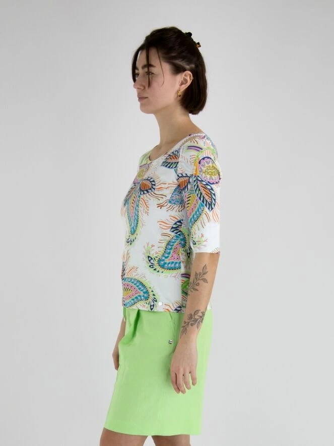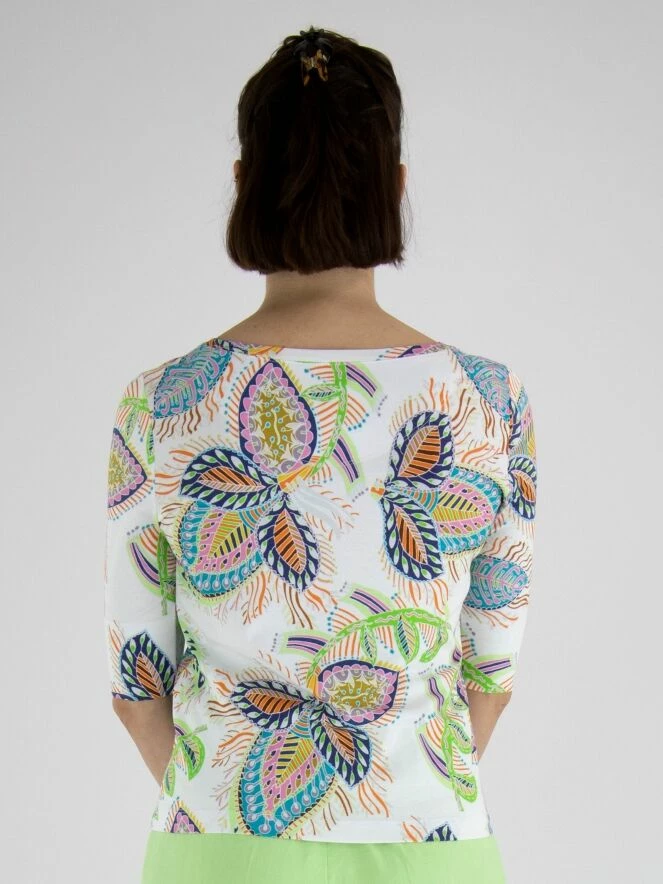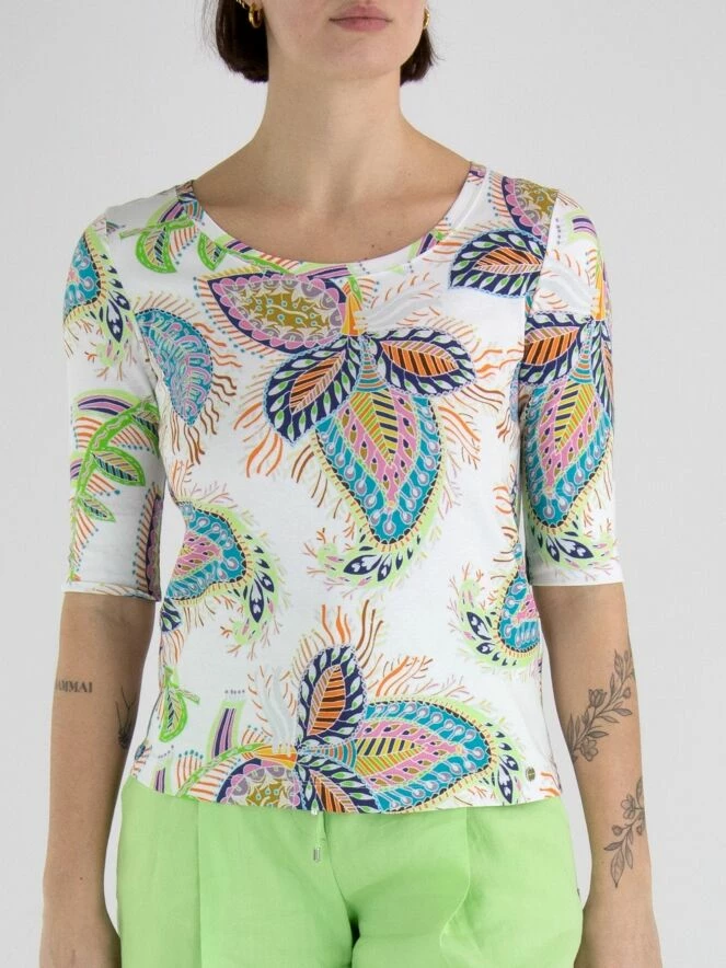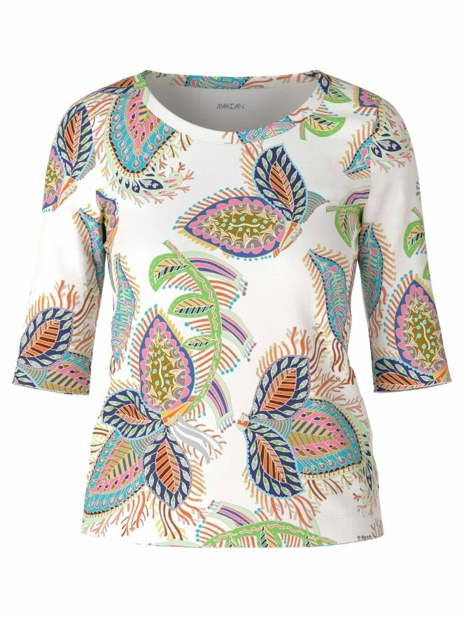 Un t-shirt de Marc Cain avec une impression de feuilles multicolores sur un fond crĂšme. Le t-shirt a des manches courtes et un col rond. Ce t-shirt peut ĂȘtre lavĂ© Ă 30 degrĂ©s.