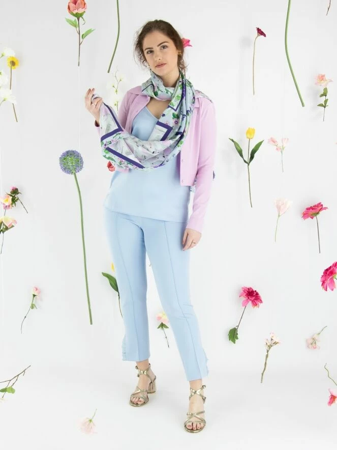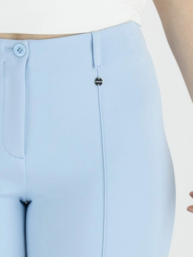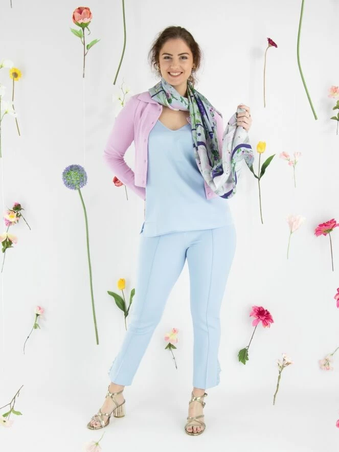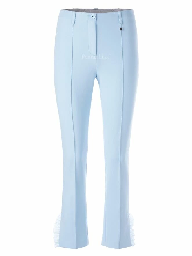 Pantalon Marc Cain de couleur bleu lavande. La taille est élastiquée. Au milieu des jambes, une couture est réalisée.  Au bas des jambes, il y a une courte bande transparente sur les côtés extérieurs. Ce pantalon peut être lavé à 30 degrés.