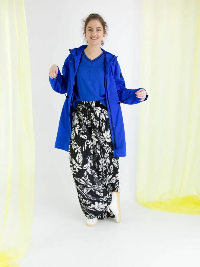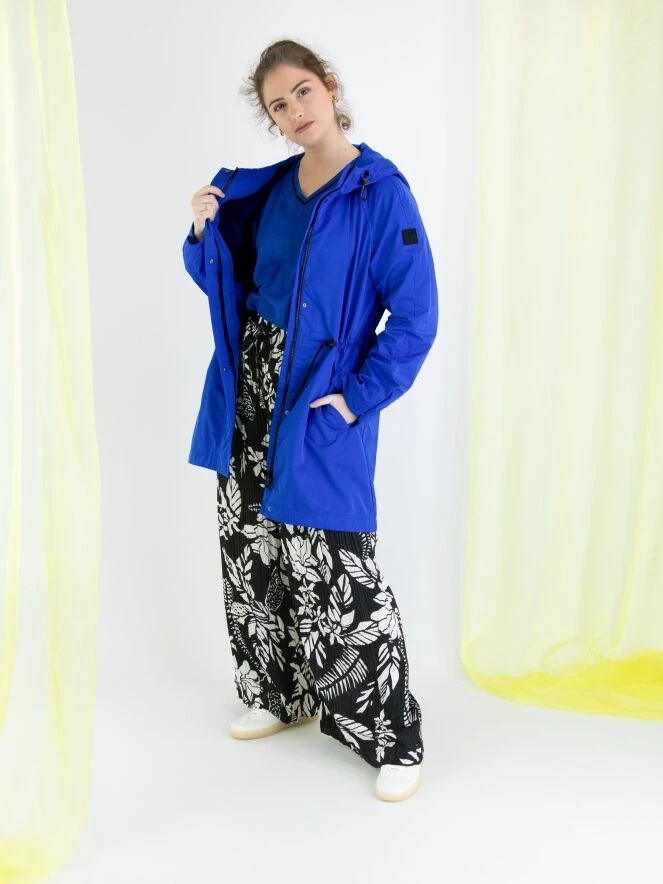 Un parka d’Ă©tĂ© de Marc Cain en bleu cobalt. Le long du bord de la capuche se trouve un cordon dans une finition tunnel qui peut ĂŞtre resserrĂ© pour ajuster la capuche. Un cordon similaire est prĂ©sent Ă la taille. Le manteau a des poches plaquĂ©es et peut ĂŞtre lavĂ© Ă 30 degrĂ©s.