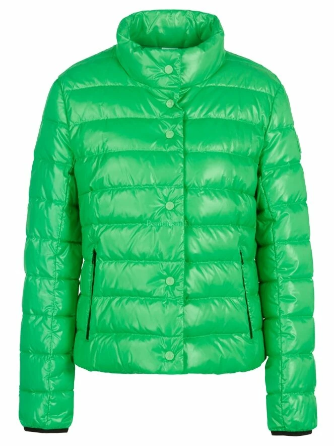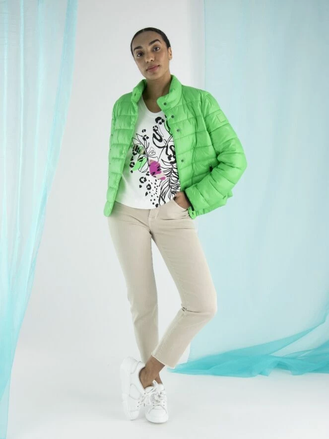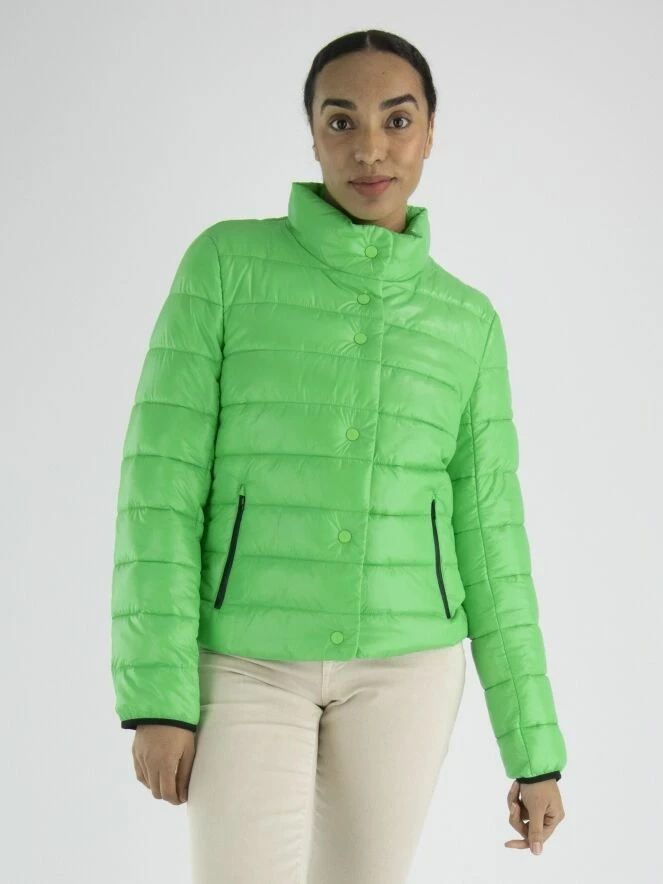 Un manteau court matelassé de Marc Cain dans une couleur verte fraîche. Le manteau a une fermeture à boutons-pression. Les poches latérales ont une fermeture éclair noire. Ce manteau peut être lavé à 30 degrés.