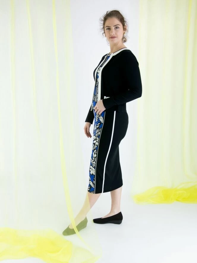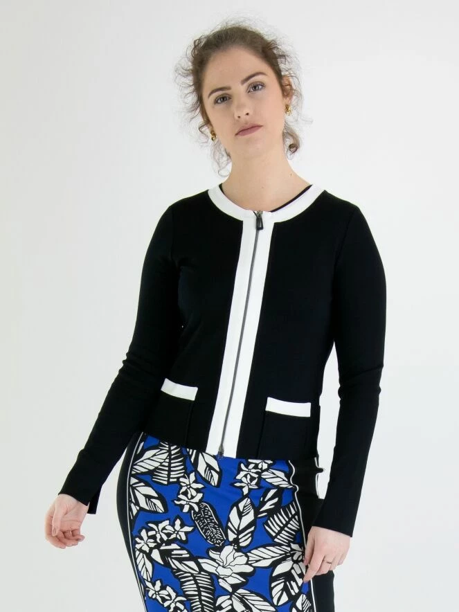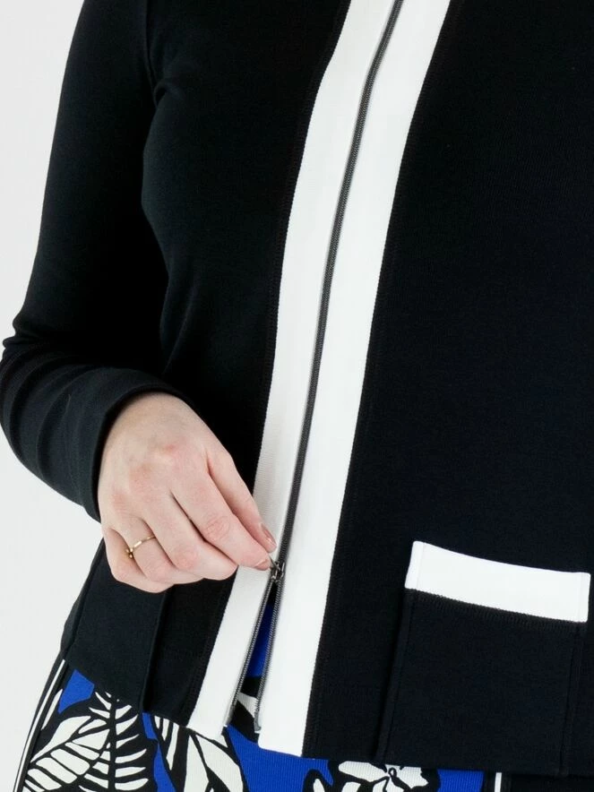 Un cardigan de Marc Cain en couleur noire avec une large bordure blanche le long de la fermeture éclair qui se prolonge dans le col rond. Les bords des poches sur le devant sont également en blanc. Ce cardigan peut être lavé à 30 degrés.